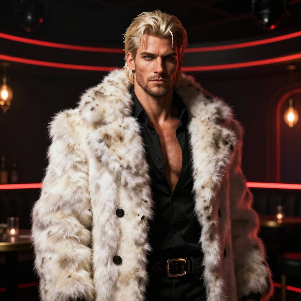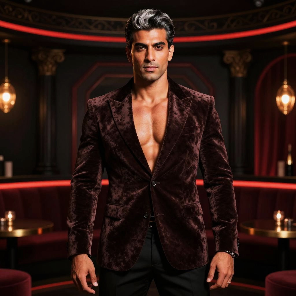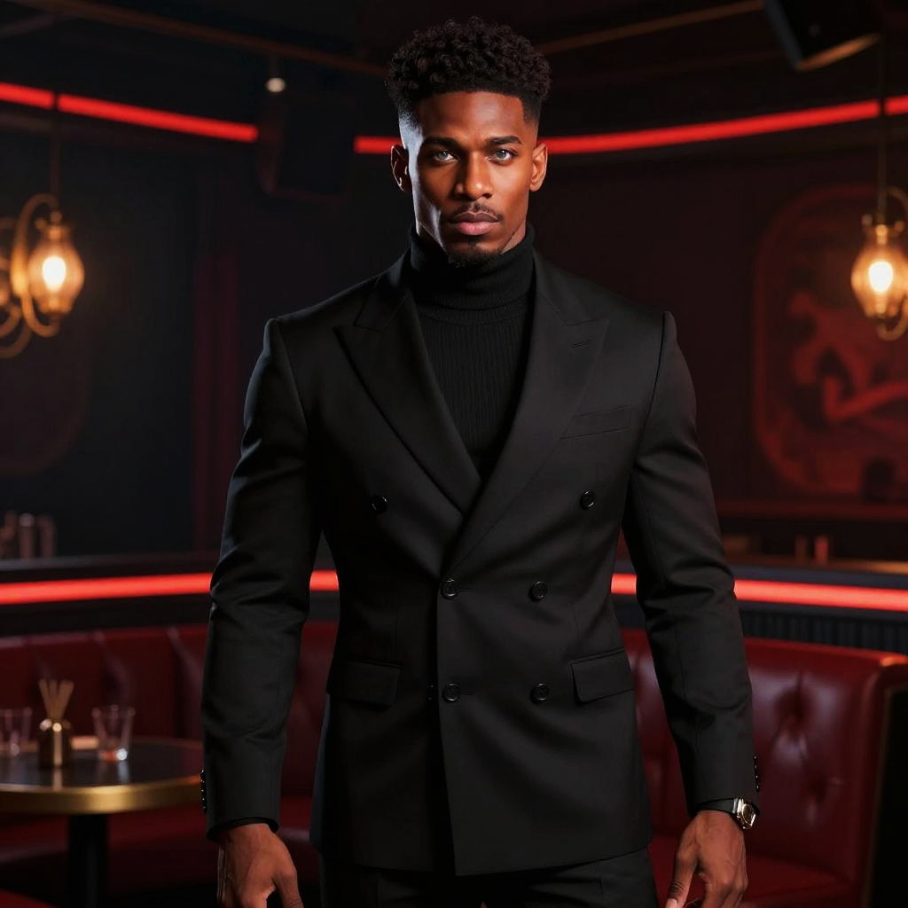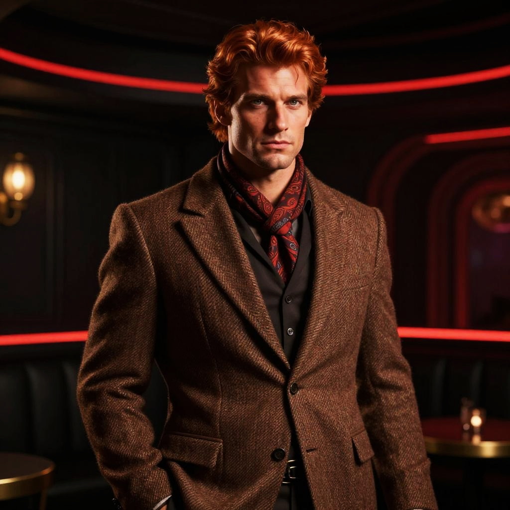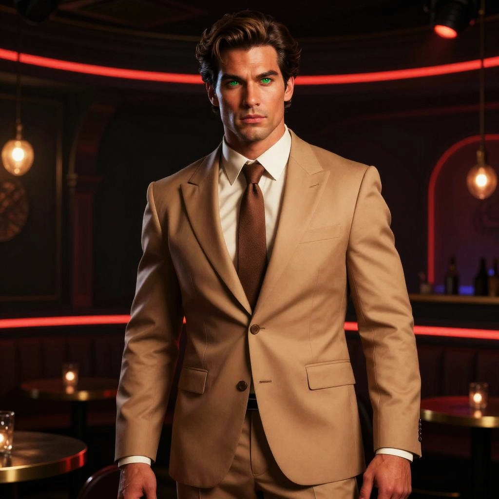 Vintage art full body portrait of a handsome Mixed Asian and Caucasian man with wavy brown hair and emerald green eyes, muscular build, wearing tailored tan suit with a cream dress shirt and brown tie, standing in a nightclub with black and red decor, dramatic lighting, Unreal Engine render, god lighting, 8K, highly detailed, cinematic lighting, dark magic theme, ultra HDR