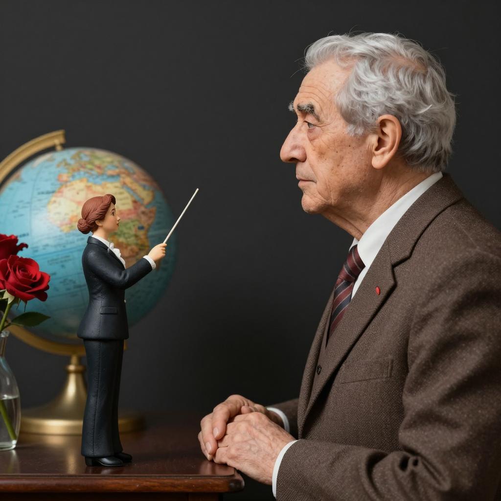 An elderly man with gray hair in a ured brown suit, profile view, facing left. In the background, a small figurine of a woman conductor holding a baton stands next to a globe and red flowers in a vase. Dark background. The man has a serious expression, and the figurine faces the left. Two people.