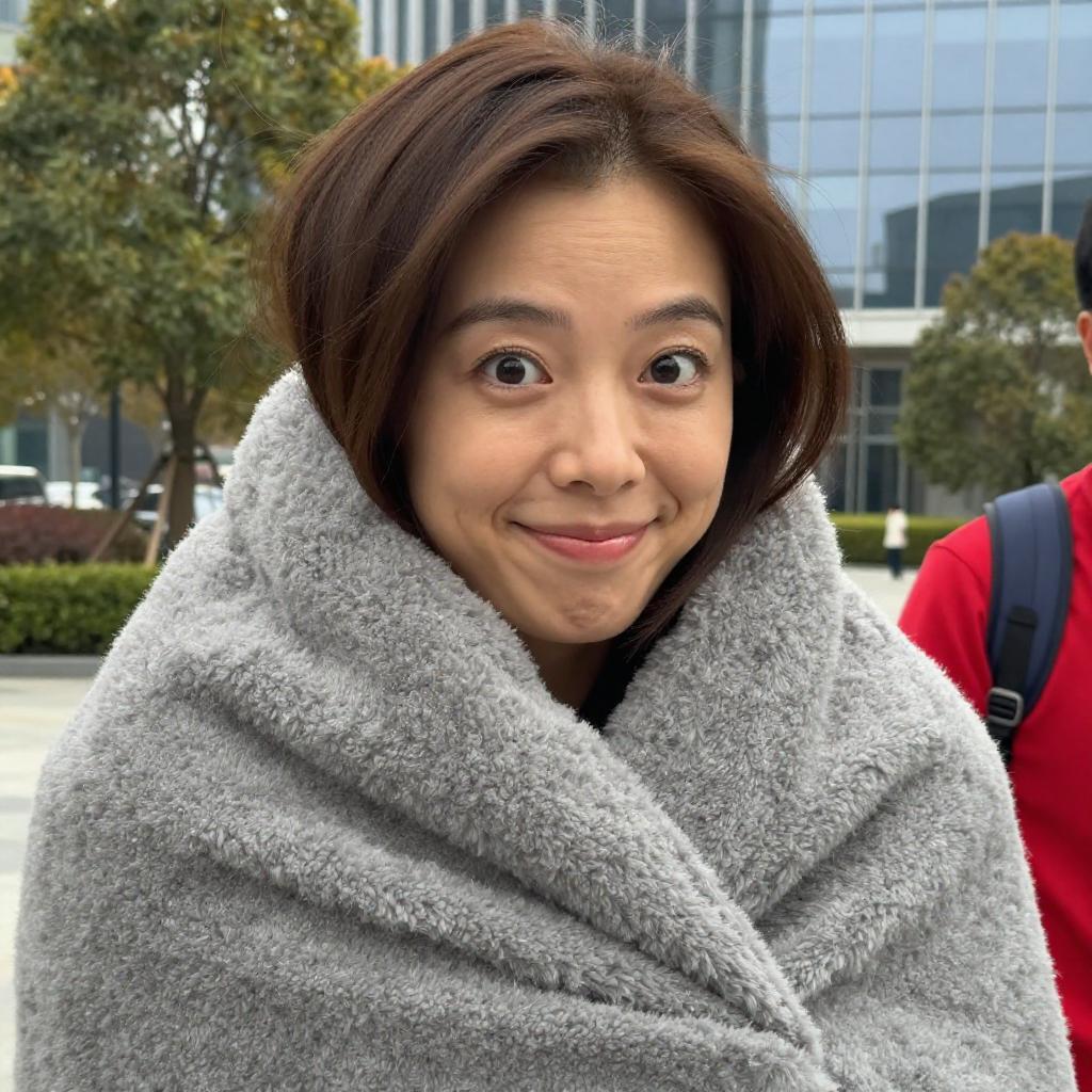Photograph of an Asian woman with short brown hair, large expressive eyes, and a playful smile, wrapped tightly in a thick, gray, ured blanket. She is outdoors, with green trees and a reflective glass building in the background. A person in a red shirt is partially visible to the right.