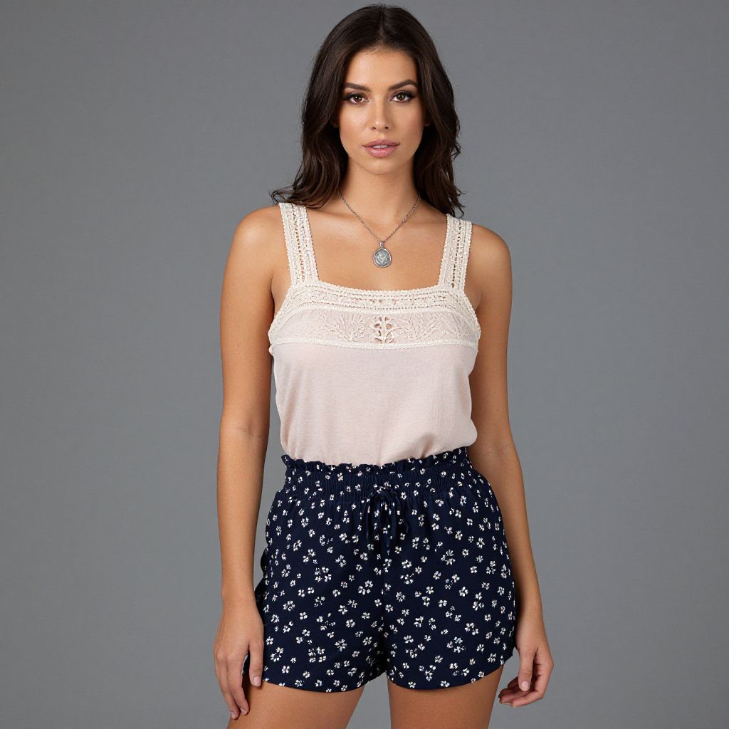 "Woman, casual boho, blush tank top with lace detailing, square neckline, thin straps, navy floral print shorts, high waisted, lightweight fabric, silver pendant necklace, gray studio background. Sexy. Pretty face and beаutiful eyes. Big breasts."
