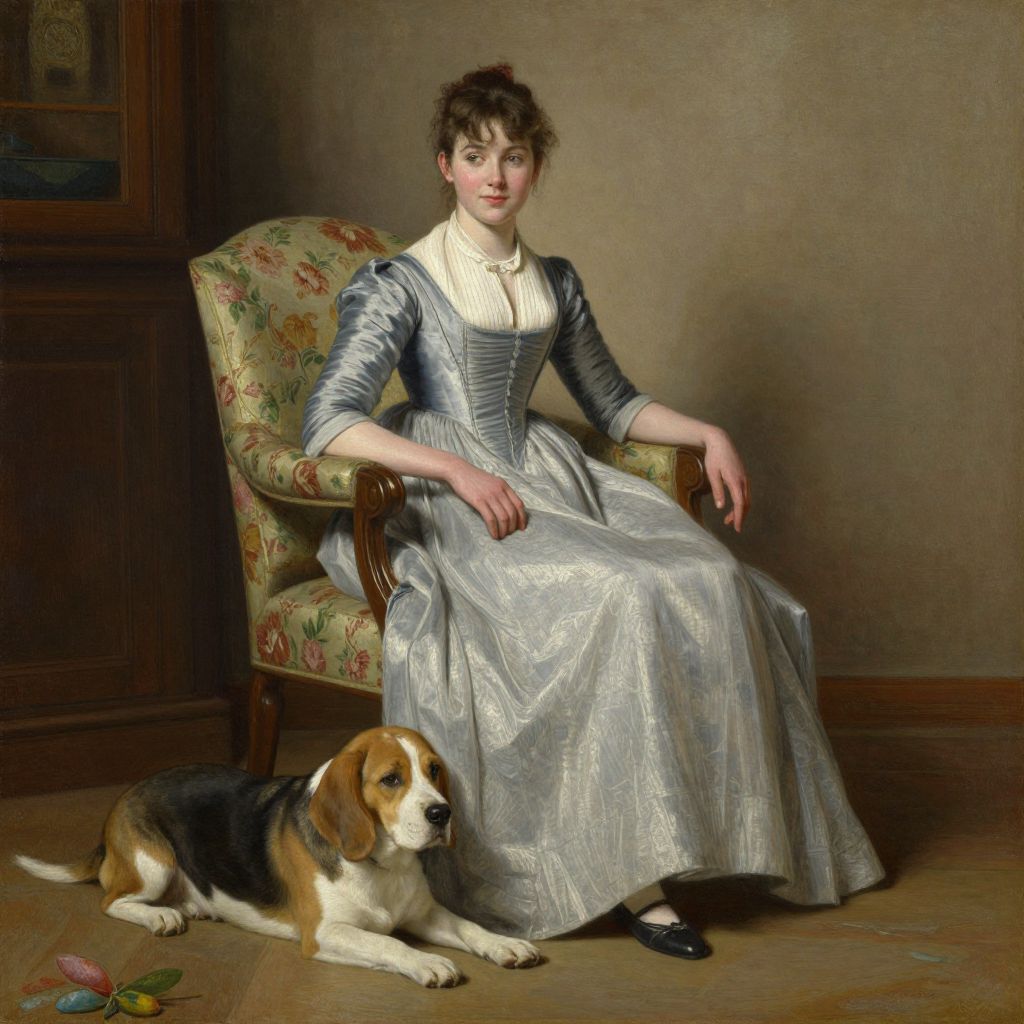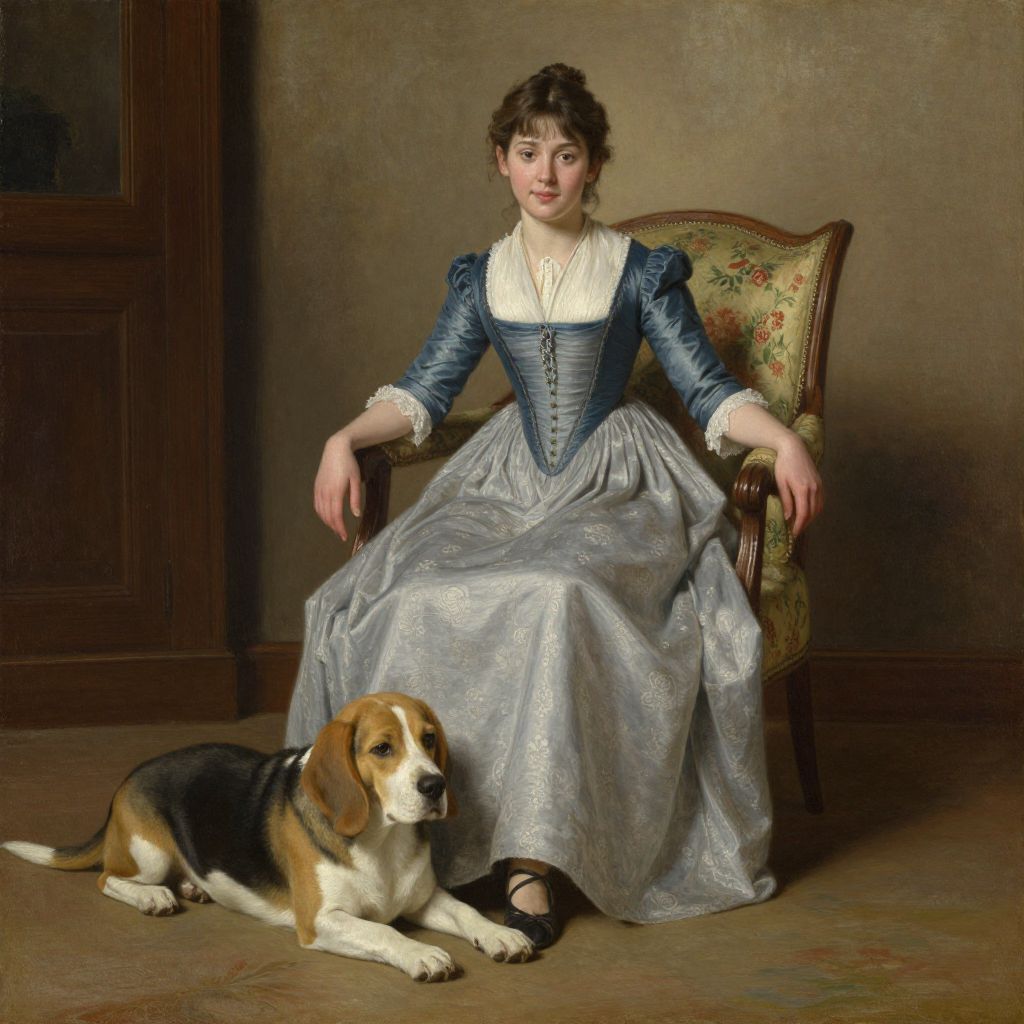 Photorealistic painting of a young Caucasian woman with fair skin and brown hair in an updo, seated in an ornate, floral-patterned armchair. She wears a blue and white striped, long-sleeved, high-collared dress with a full, silver-gray skirt and black shoes. In front of her, a Beagle dog with brown, black, and white fur lies on the wooden floor. The background features a brown, textured wall and a wooden cabinet on the left. The woman's expression is calm, and the painting has a classical, realistic style.