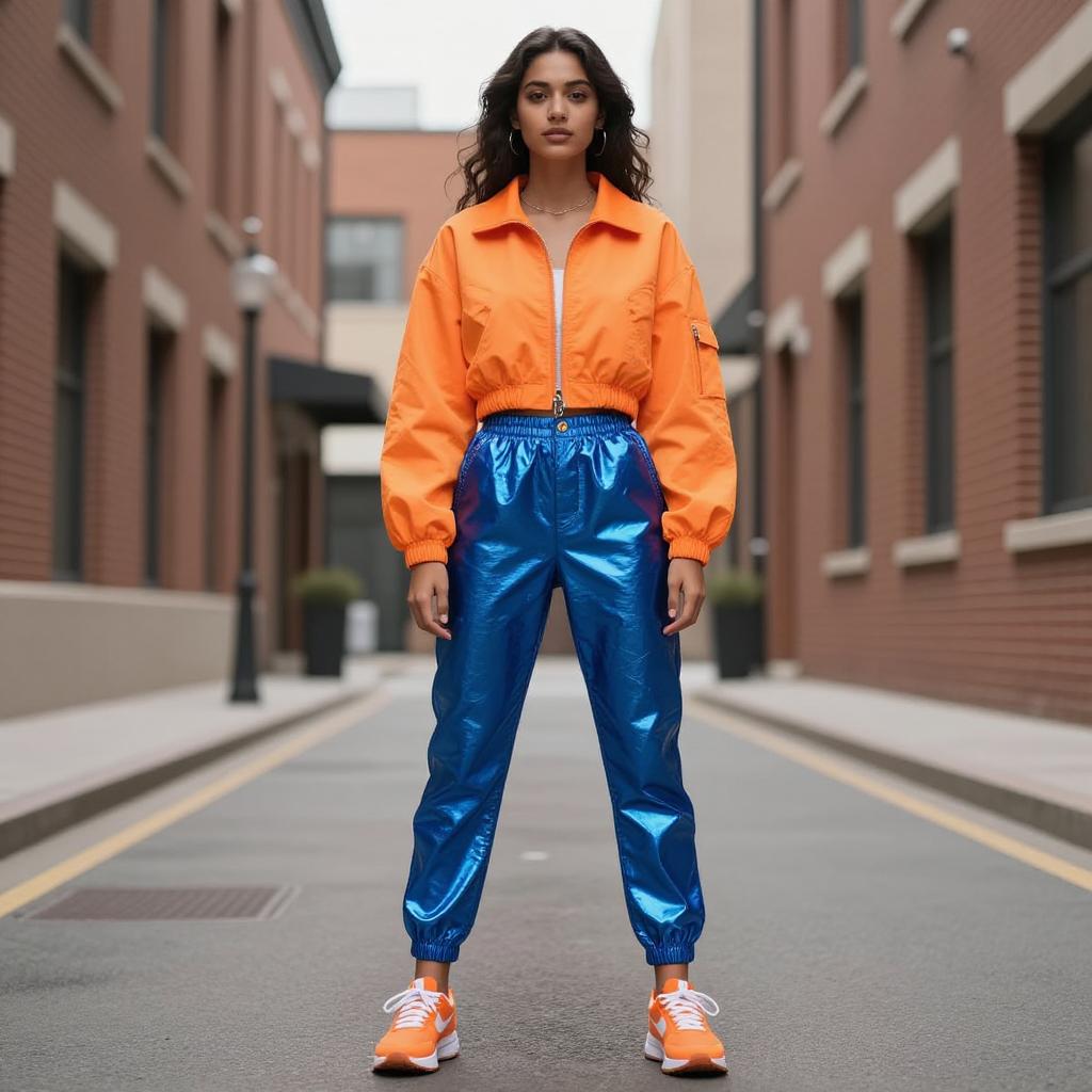 Young woman wearing a bright neon green cropped jacket, matching neon green sneakers, high-waisted blue jeans, and a black crop top, standing confidently in front of a colorful graffiti mural. She has short dark hair and is accessorized with hoop earrings and layered necklaces.
