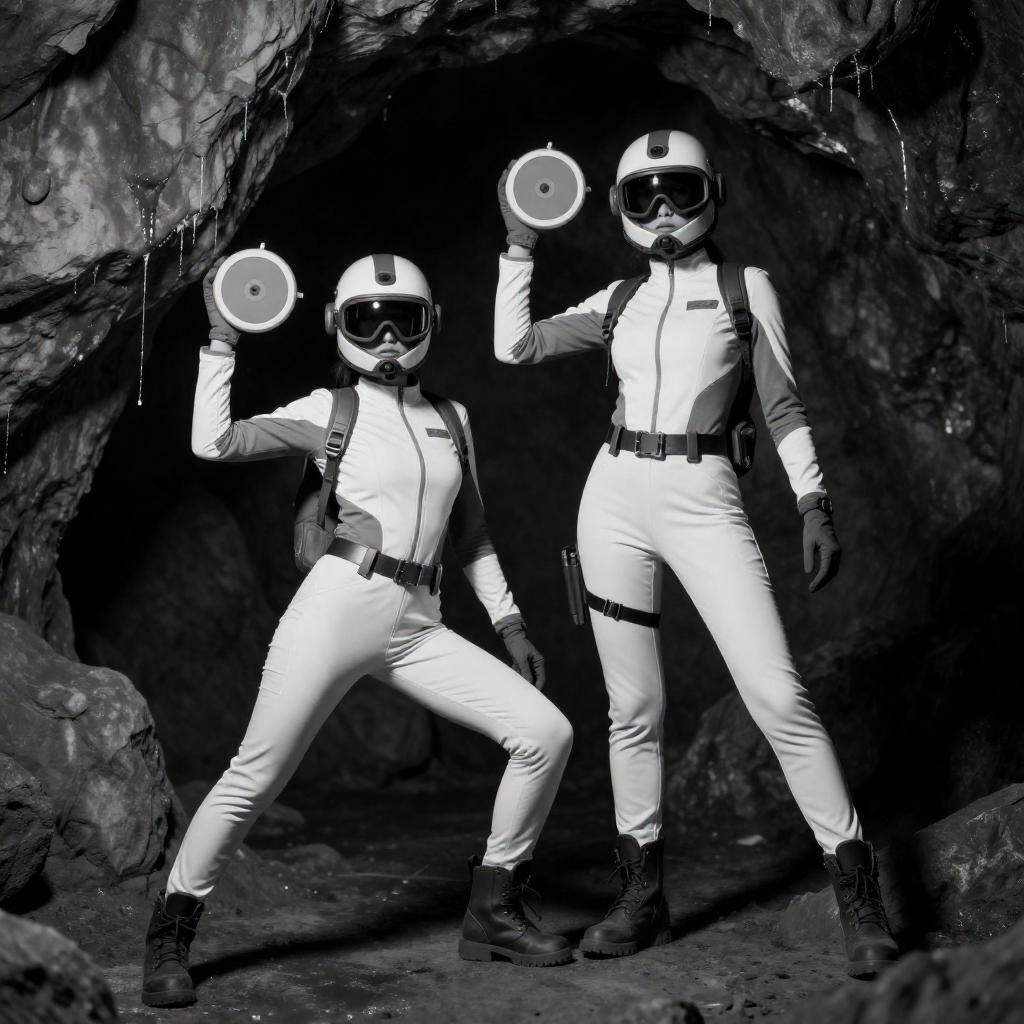 CGI image of a yellow UFO with a dome light, set in a pink and red, cave-like environment. Two women in black leather outfits and helmets, one with short hair and the other with long hair, cling to the UFO's side. The woman with long hair is suspended mid-air, reaching towards the UFO. The scene is illuminated by the UFO's light, casting dramatic shadows.