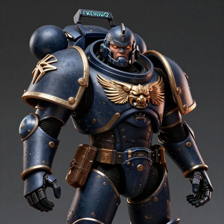 CGI image of a muscular, armored warrior in dark blue with gold accents, winged emblem, and "FRAPPUQ" on helmet,