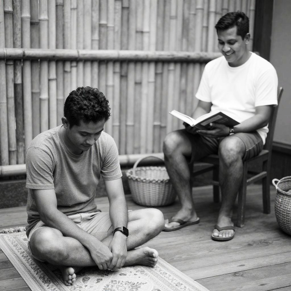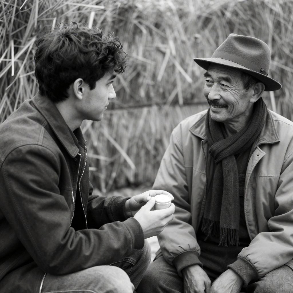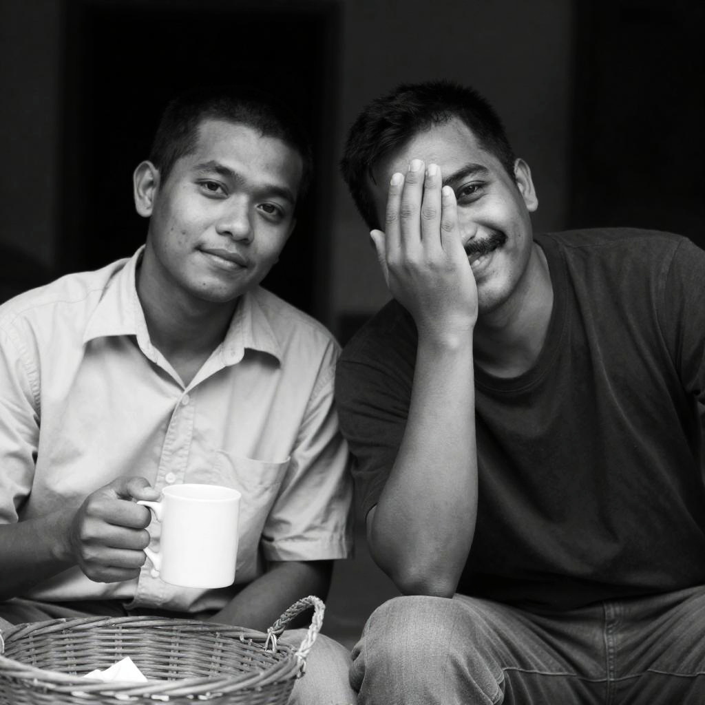 Black and white photo of two young men sitting closely. The man on the left has short hair, wears a light-colored shirt, and holds a white mug with a wicker basket in front. The man on the right has a mustache, wears a dark shirt and jeans, smiles while covering part of his face with his hand. The background is dimly lit, creating an intimate atmosphere.