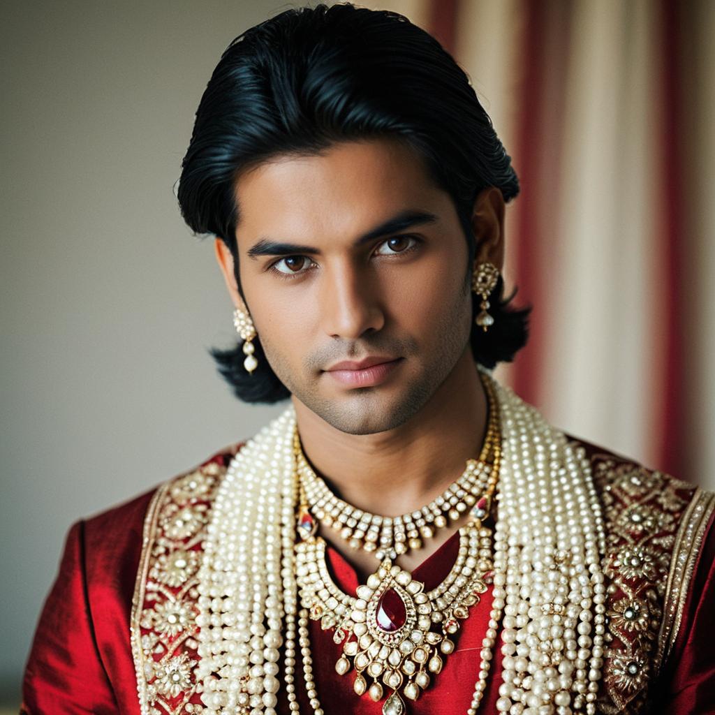 Bridegroom costume indian,solo, 1boy, jewelry, male focus, necklace, earrings, blurry background, realistic, blurry, black hair