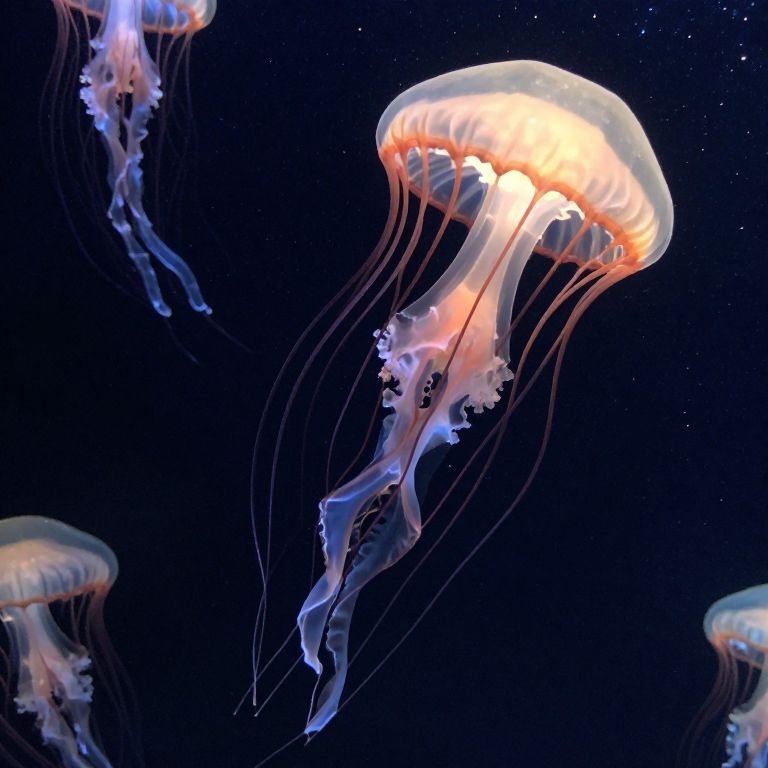 Glowing jellyfish drift gracefully against a starry backdrop, its translucent bell radiating warm hues while delicate tentacles cascade like rivers of stardust.