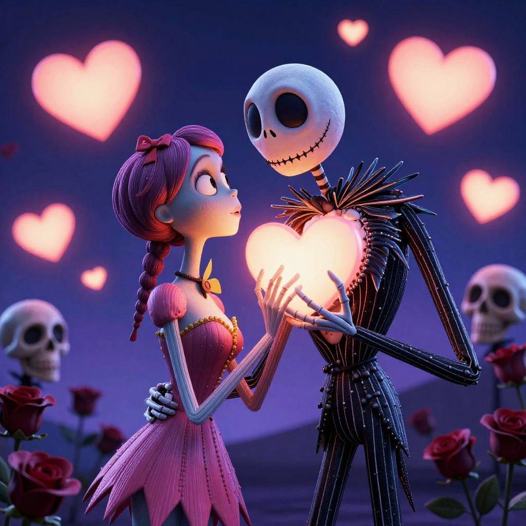 The Nightmare Before Valentine’s Day, Jack Skellington and Sally, showing affection, glowing hearts, a Valentine love fest, skulls and black roses, night sky in the background, style of Tim Burton, stop motion animation, cinematic composition, trending on Pixiv Fanbox, popcore anime art style, vibrant colors, vivid, glowing