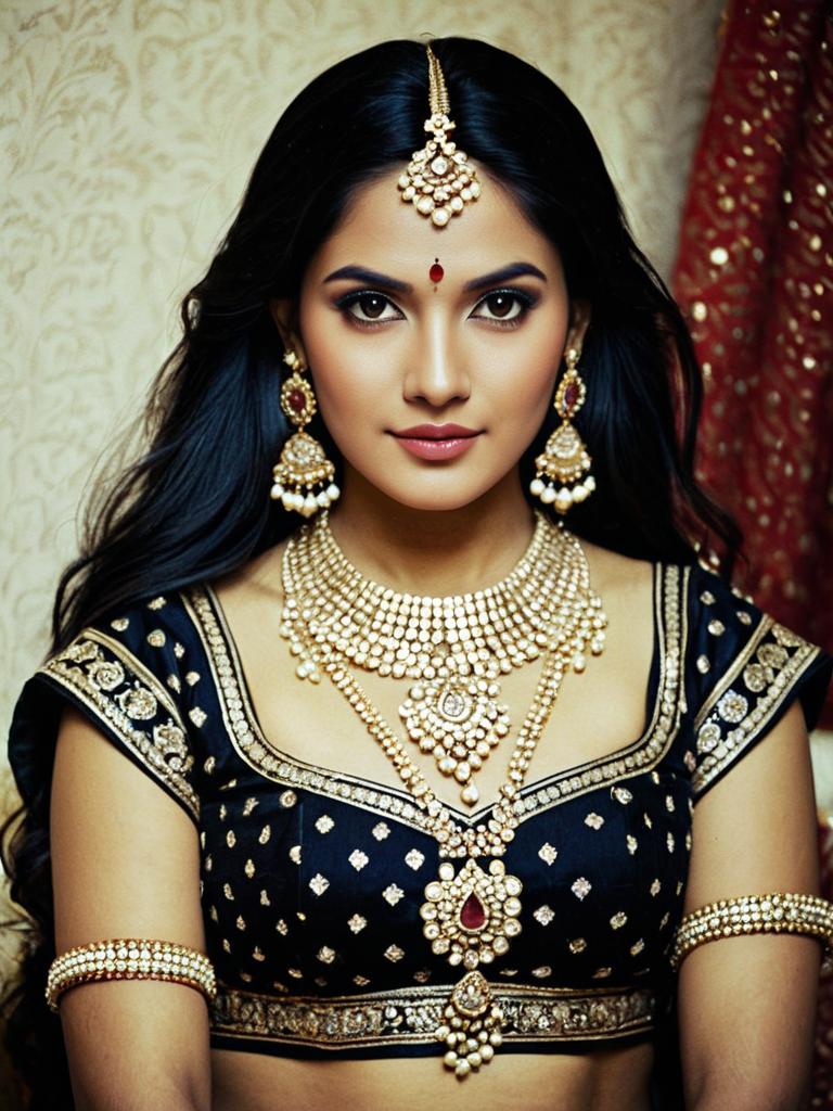 Heavy lehenga choli wedding, 1girl, solo, jewelry, black hair, earrings, realistic, bracelet, long hair, looking at viewer, necklace