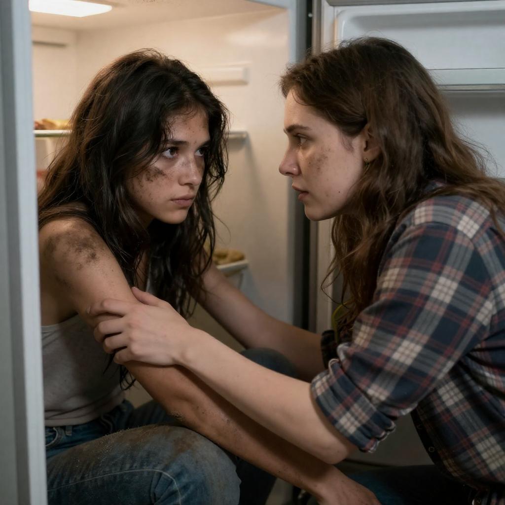 Photograph of a woman with long brown hair, wearing a plaid shirt, leaning forward, gripping the arm of a woman with long dark hair, smeared with dirt, inside a grimy refrigerator. Smeared face, intense expression. Two women. Refrigerator with dirt and debris.