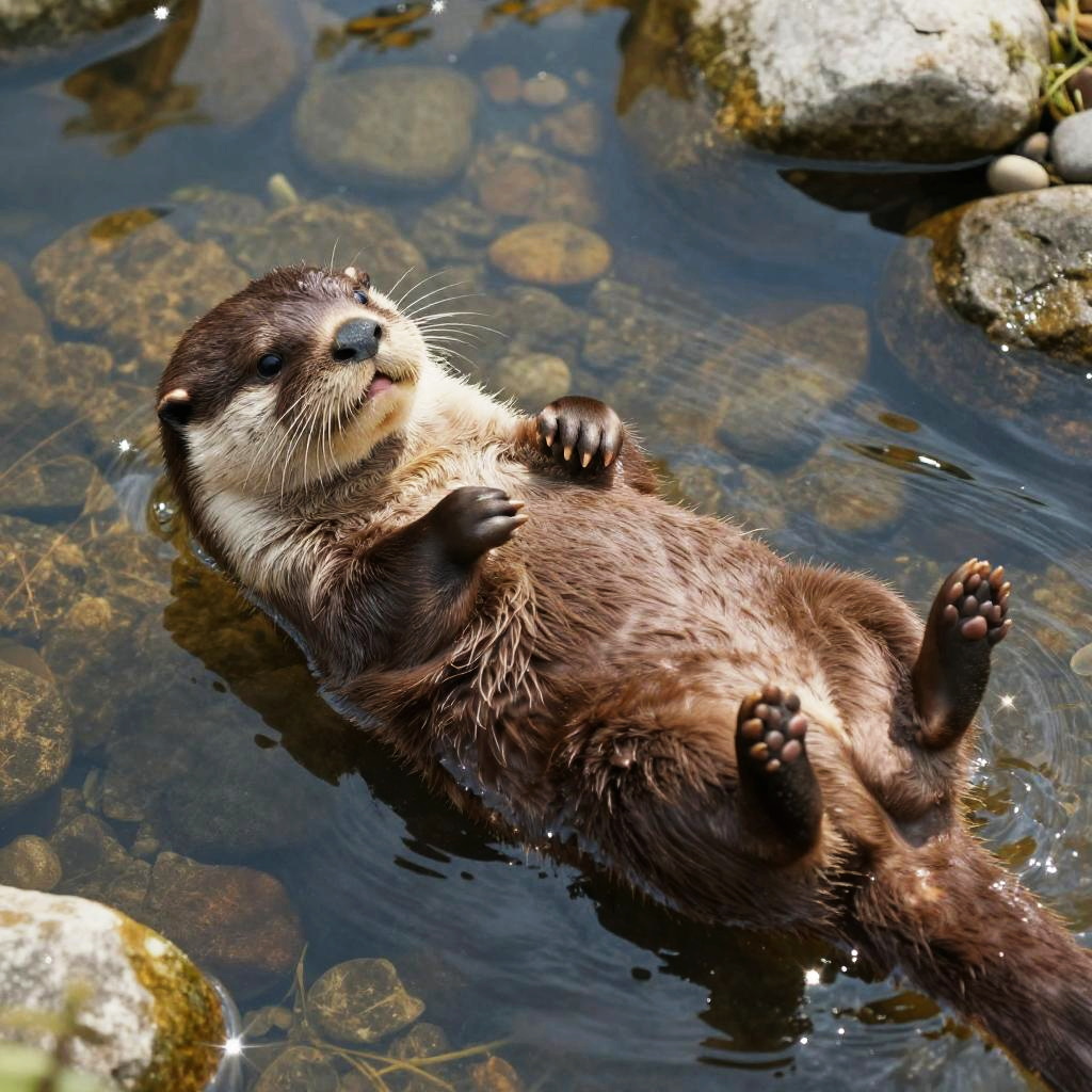 A highly detailed image of a playful otter floating on its back in a crystal clear river. The water is shallow with smooth stones visible beneath the surface. Bright sunlight sparkles on the water, highlighting the otter's intricate fur patterns and creating gentle shadows. The scene has a serene and inviting atmosphere, perfect for relaxation.
