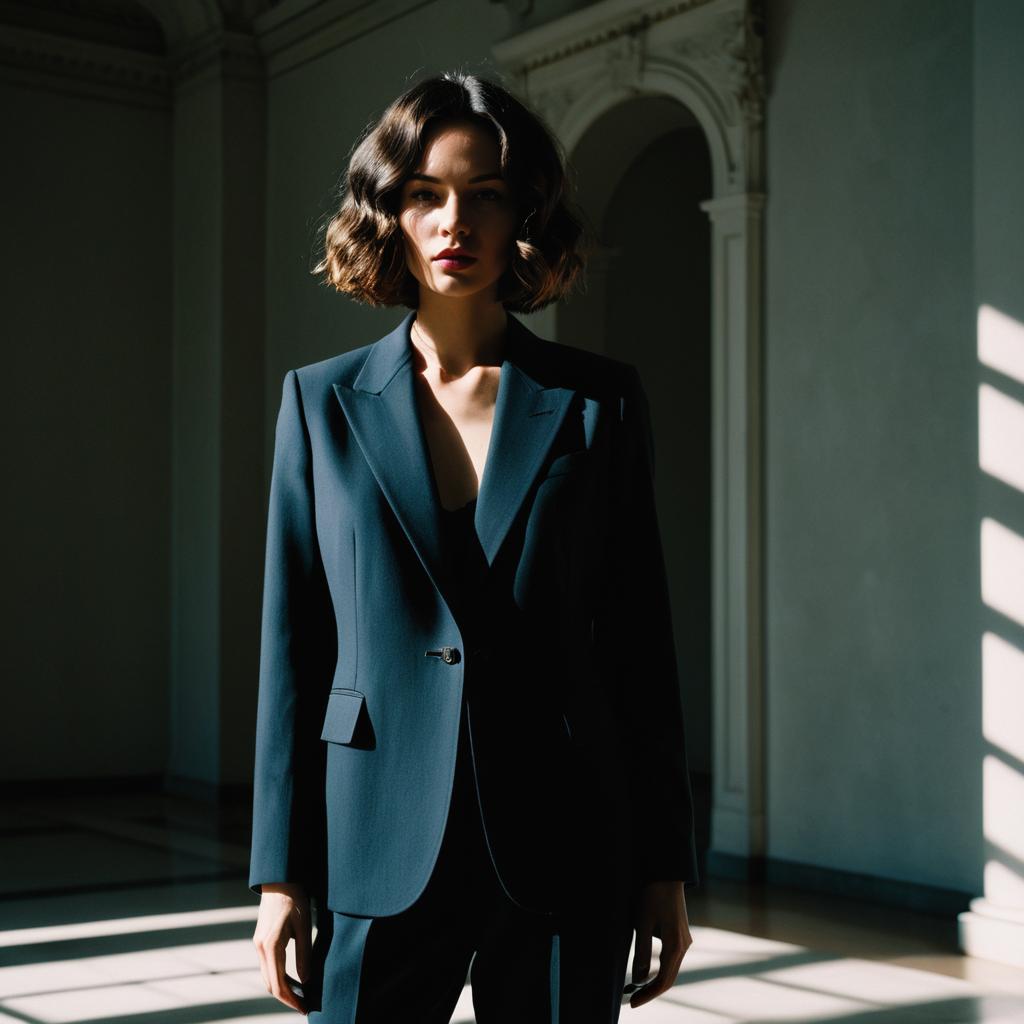 A-Line Bob hairstyle on fashion model, wearing minimalist white jumpsuit, in modern hall, captured in fashion editorial style with soft morning light.