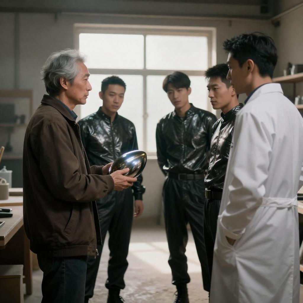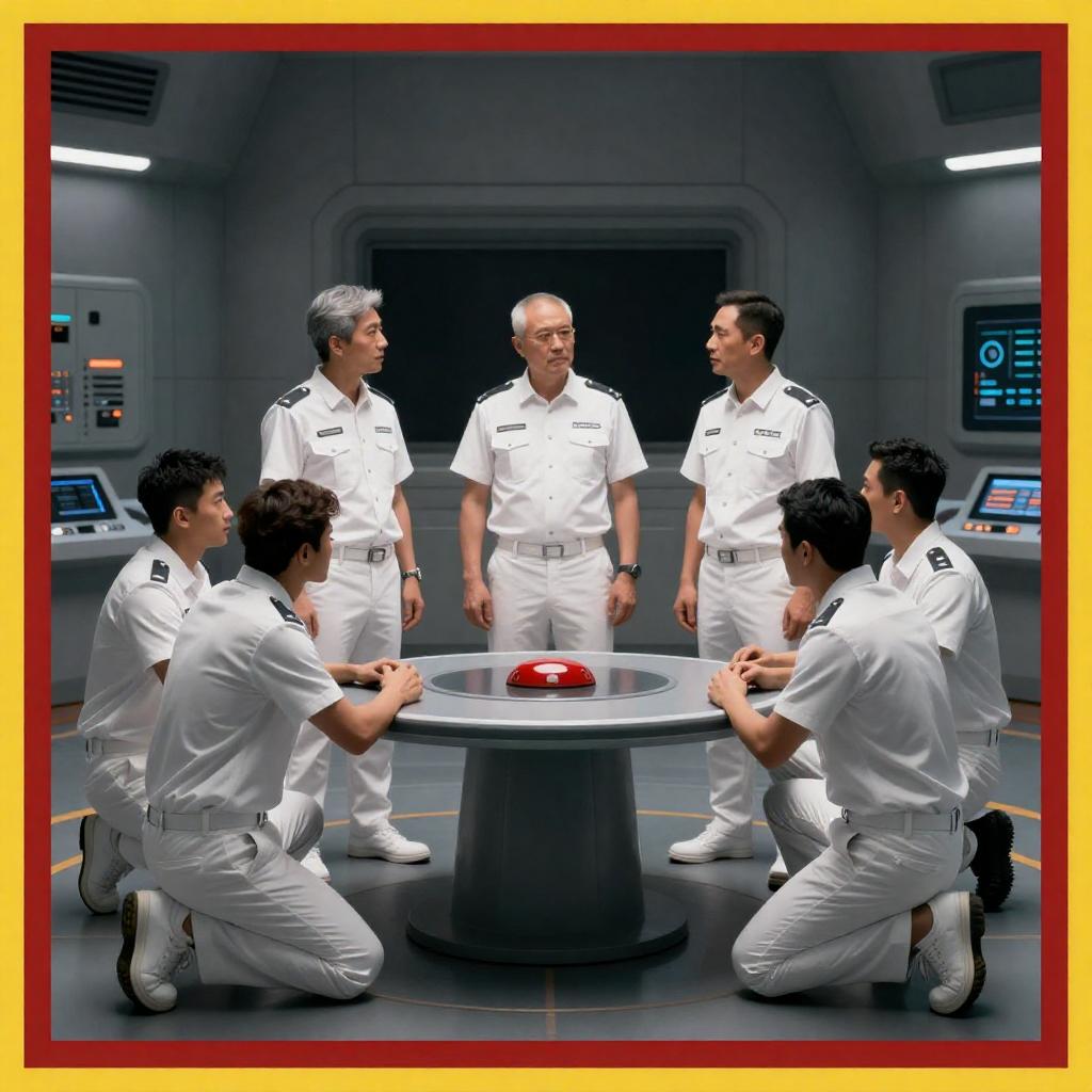 Photograph of a futuristic, metallic corridor with six people standing in a line facing an older man in a dark blue uniform. Five individuals wear white outfits and yellow shoes, while one person on the left wears a yellow jumpsuit. The corridor has overhead lights and seating on both sides. The man in the uniform stands centrally, looking at the group.