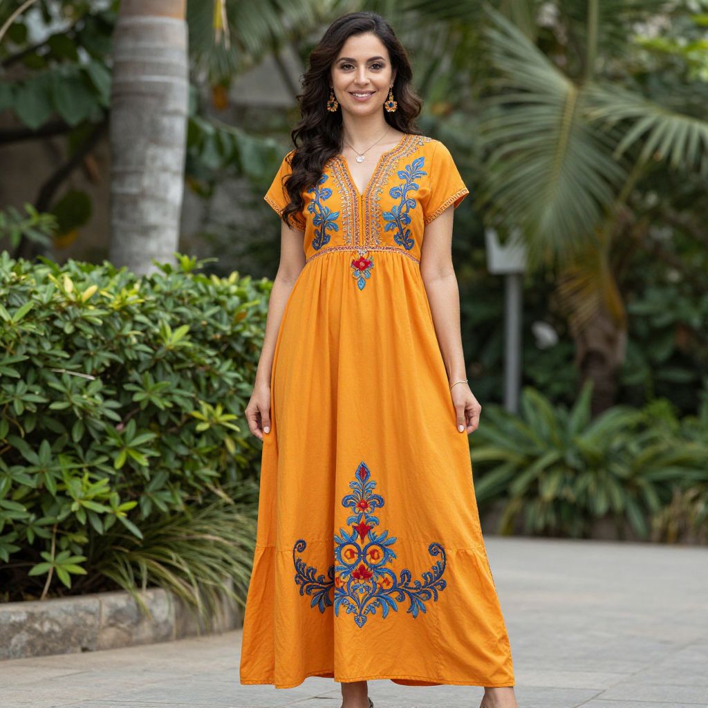 Smiling woman wearing a vibrant orange maxi dress with intricate blue and red embroidery stands outdoors amidst lush greenery, showcasing local fashion and resort wear craftsmanship.