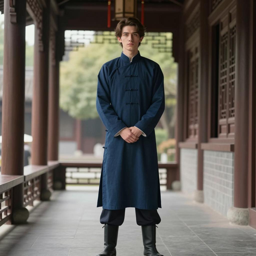 Apple white costume, photorealistic, male, standing, front view, wearing white hooded robe, loose-fitting, tied at waist, serious expression, medium skin tone, Asian ethnicity, outdoor setting, daytime, blurry background, trees, red and orange decorations, traditional building on right, light green plants, soft sunlight, calm atmosphere, realistic ures, slightly shiny fabric, modern historical style, focused subject, natural light, subtle shadows, symmetrical composition