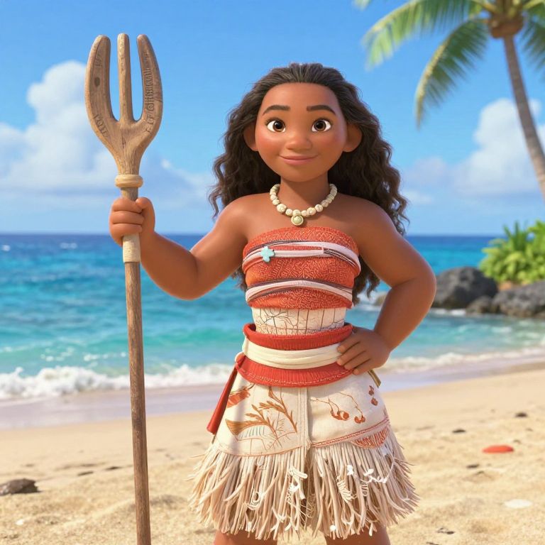 Photorealistic digital illustration of a young Polynesian girl standing on a sandy beach with a turquoise ocean and palm tree in the background. She has dark, wavy hair, brown skin, and large, expressive eyes. She wears a strapless, red and white striped top with a white fringed skirt adorned with red floral patterns, and a white shell necklace. She holds a wooden trident in her right hand. The sky is bright blue with fluffy white clouds. The overall style is vibrant and cartoon-like.