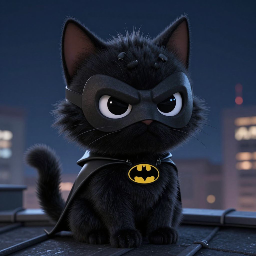 Cute CGI black kitten with Batman mask and cape, featuring yellow Batman symbol on chest, sitting on rooftop at night.