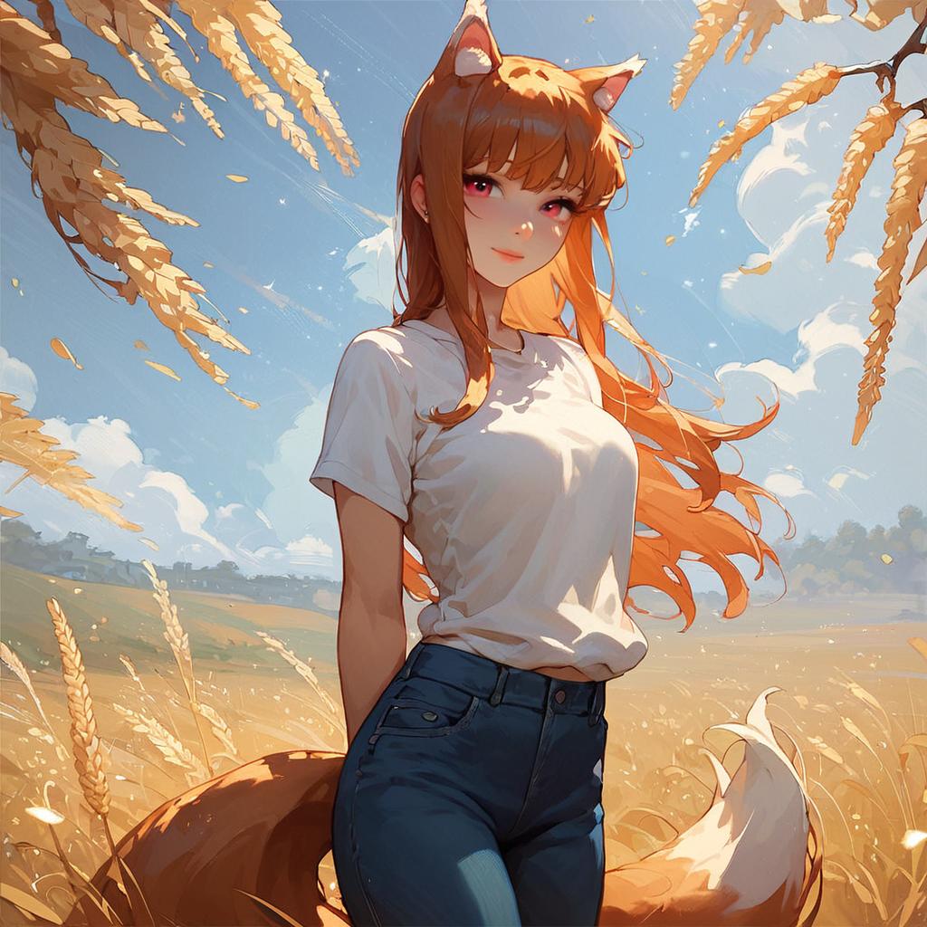Score_9, score_8_up, score_7_up, best quality, masterpiece, sfw, source_anime1girl, solo, holo \(spice and wolf\), cowboy shot, pants, shirt, wheat field, detailed background, blush, wolf tail, smile