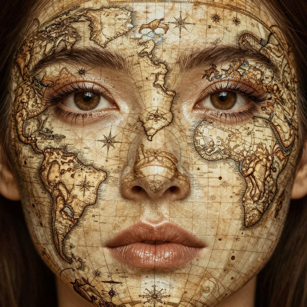 Digital artwork of a woman's face with brown eyes, superimposed with an antique map, featuring intricate black lace patterns and geographical lines over her skin