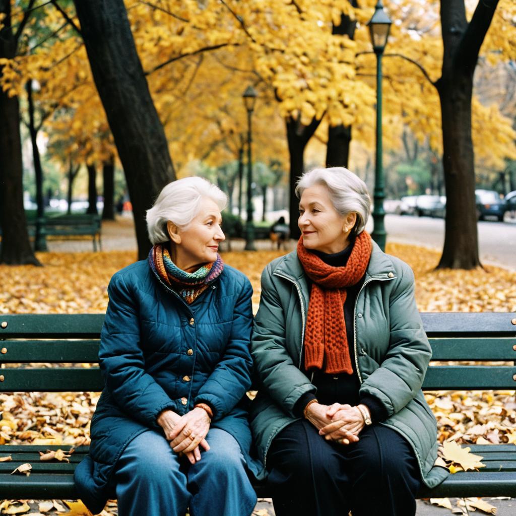 Kodak Portra cinematic film still of an elderly couple relaxing on a park bench, warm autumn jackets, knitted scarves, holding hands, surrounded by colorful fall leaves in an urban park, nostalgic and warm vibe.