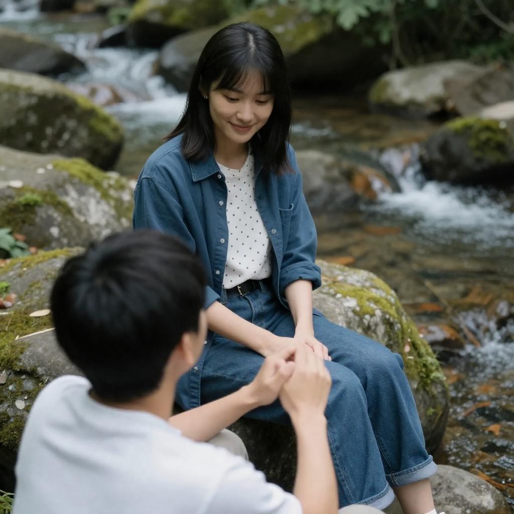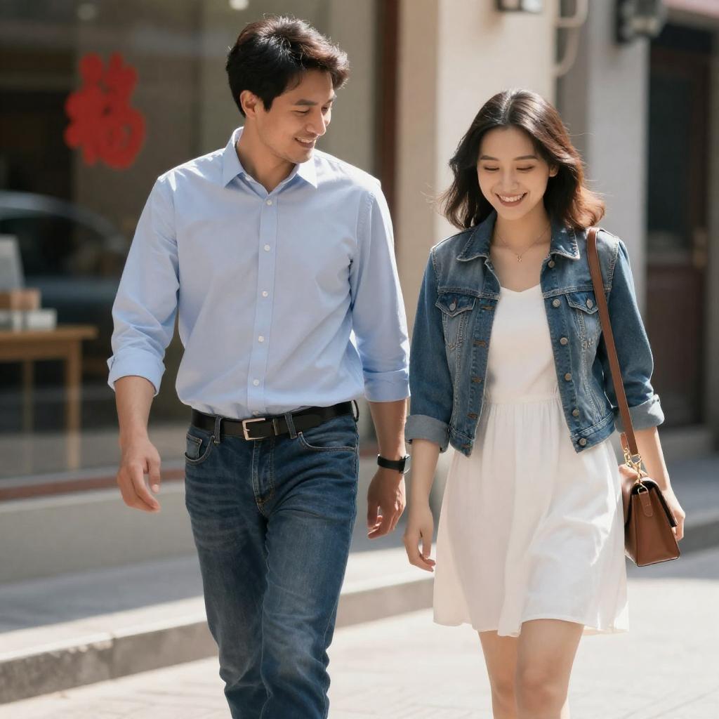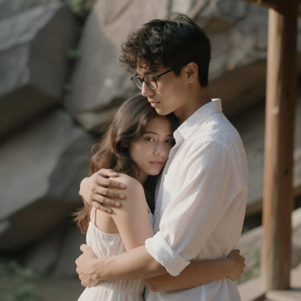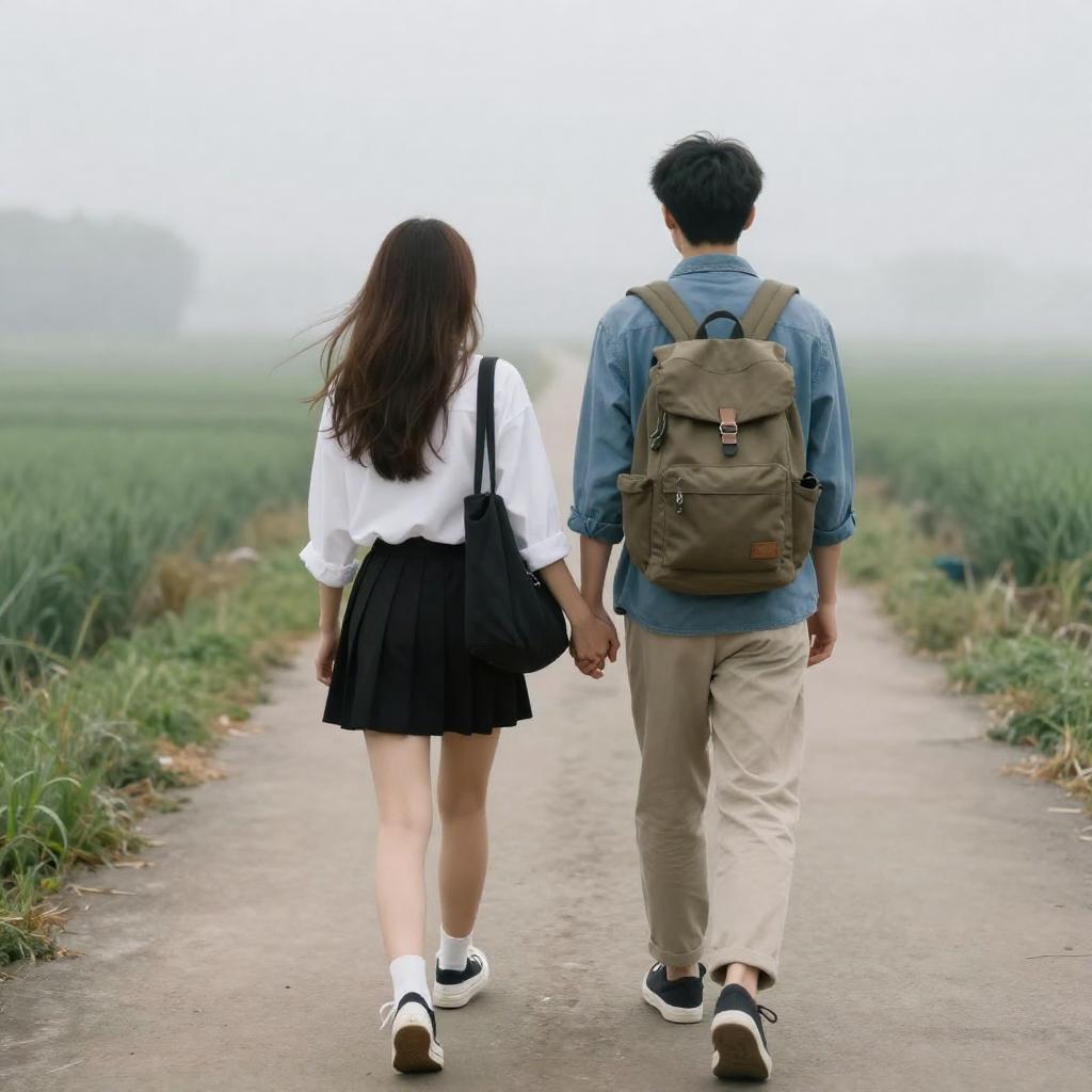 Photograph of a couple walking on a foggy rural path. Girl with long brown hair, white shirt, black skirt, black bag. Boy with short black hair, blue shirt, beige pants, green backpack. Green fields on both sides. Girl's back to camera, boy's back to camera. Holding hands. Misty background.