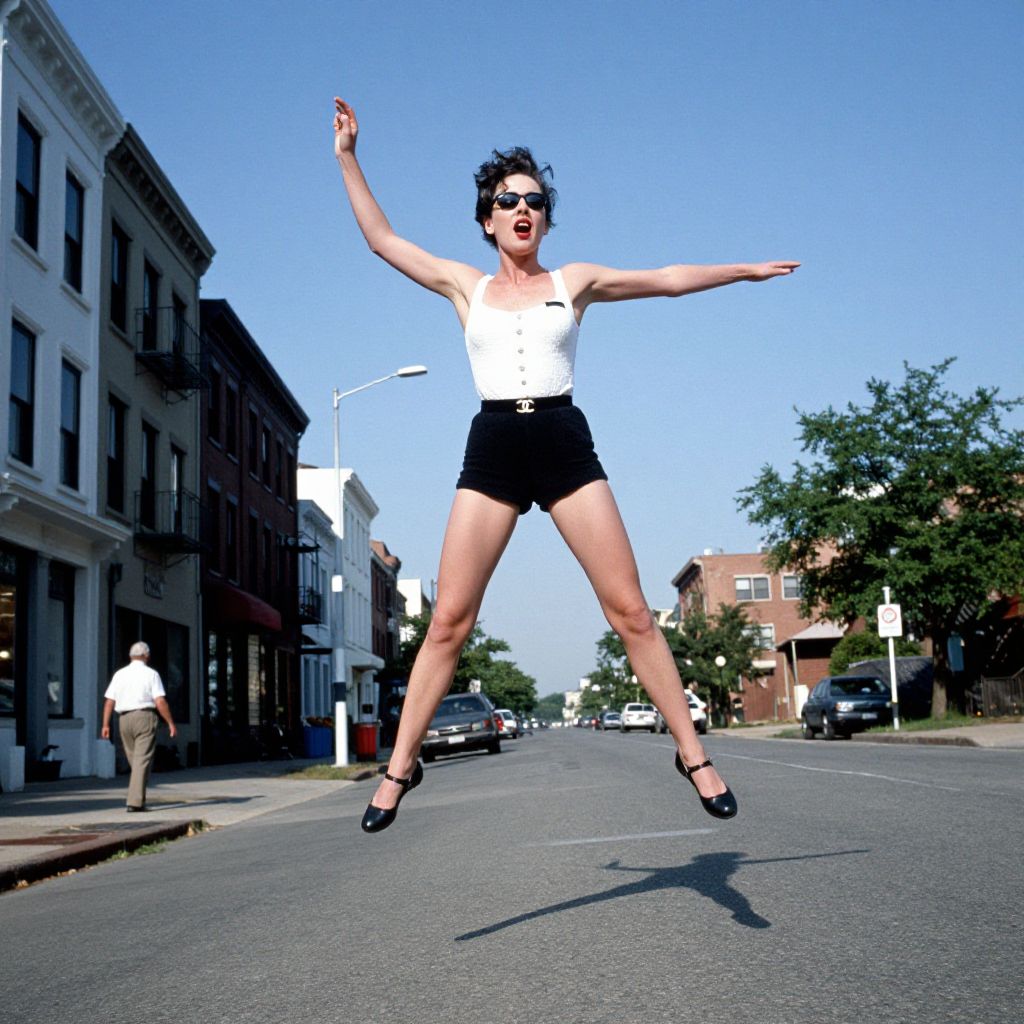 Photograph of a white woman with short dark hair, wearing black sunglasses, a white sleeveless top, and black high-waisted shorts, mid-jump on a sunny urban street. She has her arms raised and legs spread wide, exuding energy and joy. Black high-heeled shoes adorn her feet. The background features a clear blue sky, multi-story buildings with balconies, and a few pedestrians, one standing on the sidewalk to the left. Trees and parked cars are visible on the right side of the street. The image is vibrant, capturing a moment of spontaneous exuberance.