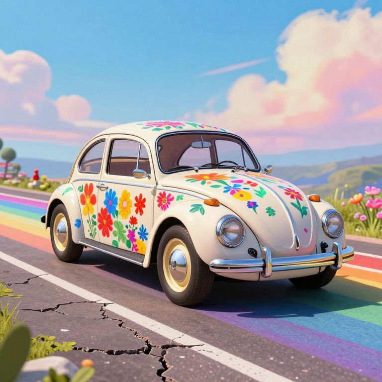 A vibrant, retro-style Volkswagen Beetle adorned with psychedelic floral patterns cruises along a surreal, cracked rainbow road, evoking a whimsical, computer-generated fantasy scene under a bright, impressionistic sky.