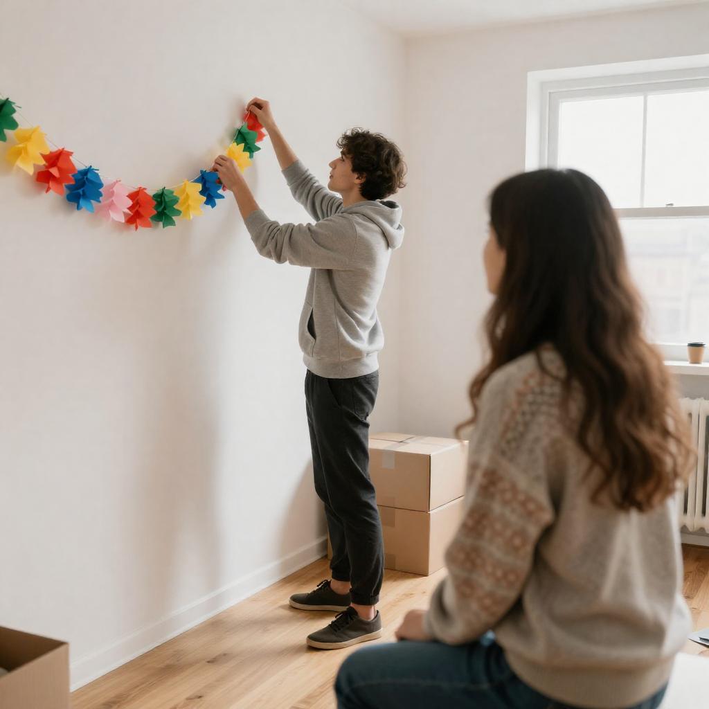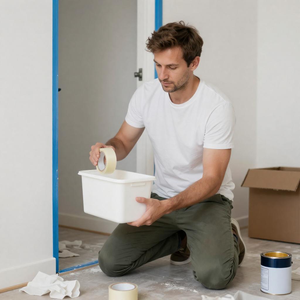 Photograph of a man and woman in a public restroom, each wiping down a black, speckled stall door with white paper towels. The man, with short dark hair and a green shirt, sits on the left, while the woman, with long brown hair and a black sleeveless top, stands on the right. Both wear dark pants and are focused on their task.