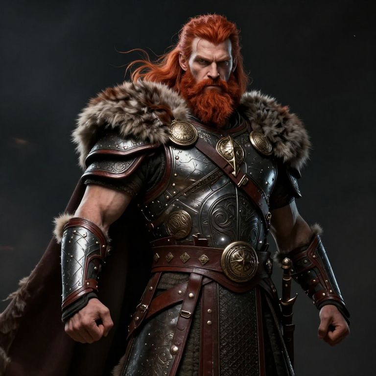 Photograph of a muscular, red-bearded man with long, flowing hair, standing against a dark background. He wears ornate, black metal armor adorned with circular patterns and a fur-trimmed cape. His arms are strong and his fists are clenched. The armor includes a chest plate, shoulder guards, and a leather belt with a large circular buckle. His intense expression and commanding stance convey a sense of power and determination. The lighting highlights the metallic sheen of his armor, creating a dramatic, heroic appearance. The overall style is reminiscent of fantasy or medieval warrior imagery.