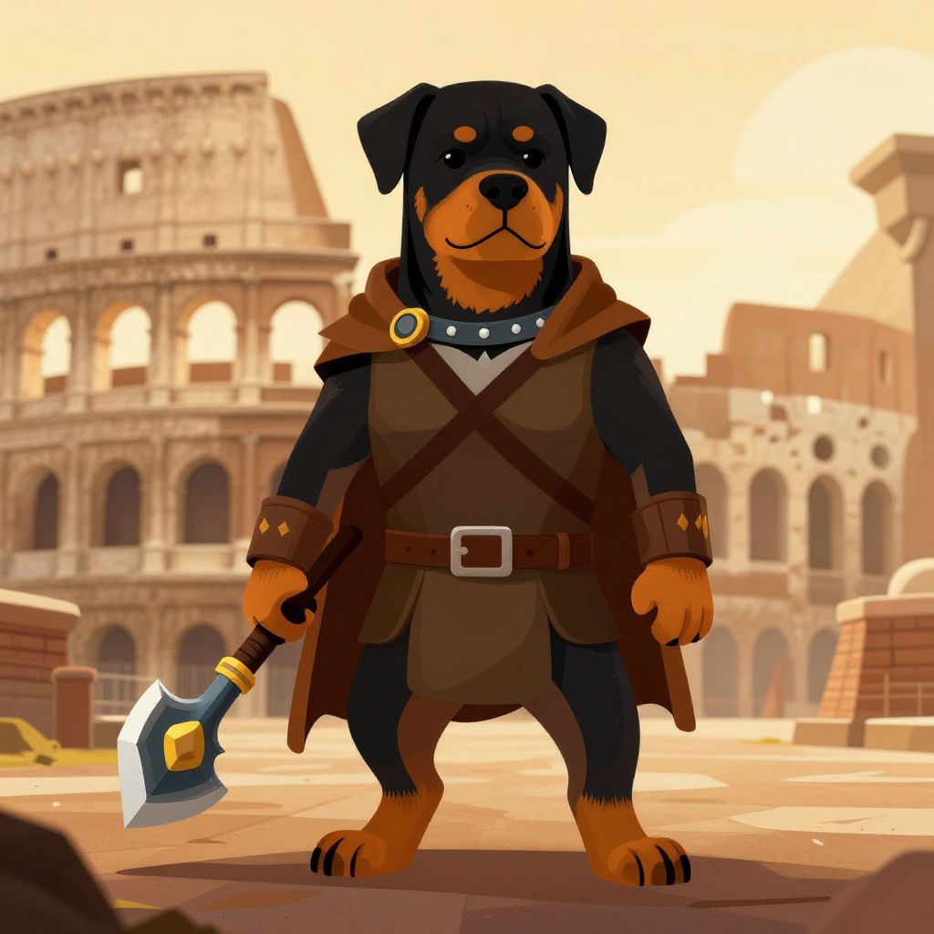 Cartoon Rottweiler warrior in brown armor, holding axe, stands confidently in front of ancient Roman ruins under a bright, orange sky.