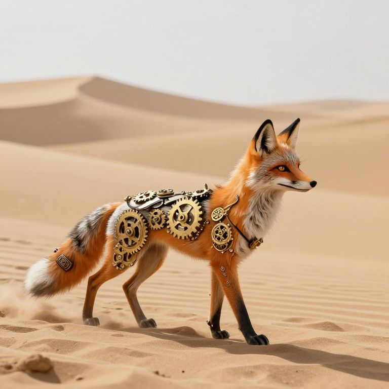 Amidst the whispers of forgotten sands, a clockwork fox, adorned with the gears of eternity, strides forward with a soulful grace, leaving behind a trail of untold stories and the echoes of time itself.