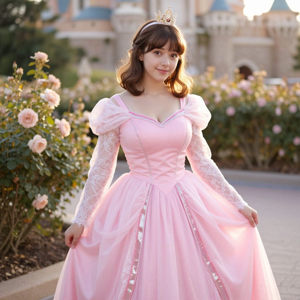 A young woman in her late teens with soft brown hair, big brown eyes, and a gentle smile wearing a big pink princess dress with flowing lace sleeves, a deep v-neck, and a full skirt that drapes elegantly, standing in a sunny castle courtyard with rose bushes and golden hour lighting, costume designed like a classic fairy tale princess with sparkly pink ribbon trim and a small crown on her head.. The woman has big tits and cute face