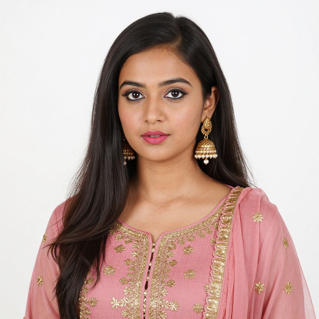 Photograph of a young South Asian woman with long, straight black hair, wearing a pink traditional salwar kameez adorned with gold embroidery. She has medium brown skin, dark brown eyes, and is wearing gold jhumka earrings. Her pink lips are slightly parted, and she has a neutral expression. The background is plain white, highlighting her attire and features. The texture of the fabric is semi-sheer with delicate patterns. The image focuses on her from the chest up, centered in the frame.