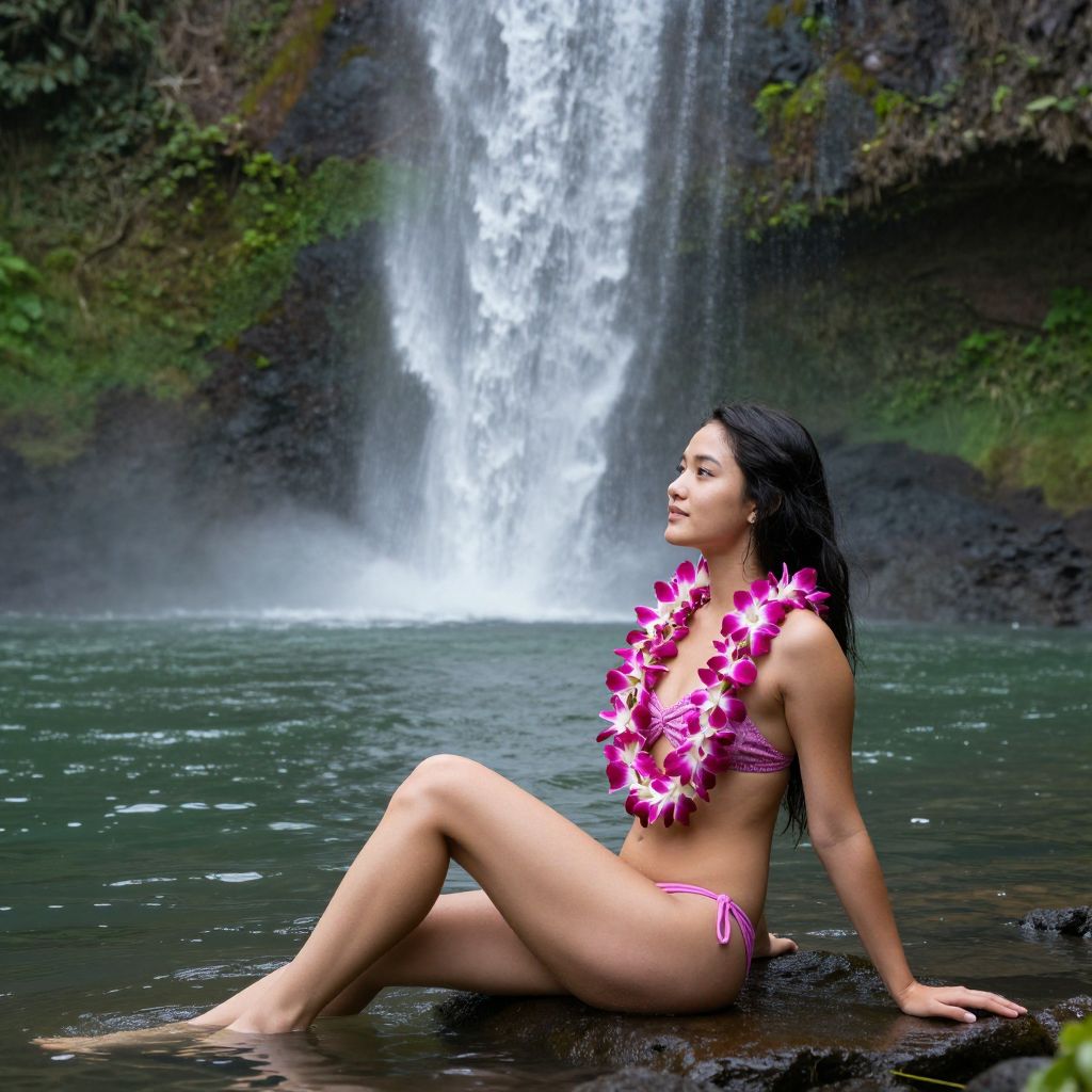Photograph of an Asian woman with long black hair, wearing a pink flower lei and white bikini, sitting on a rock by a waterfall in a lush