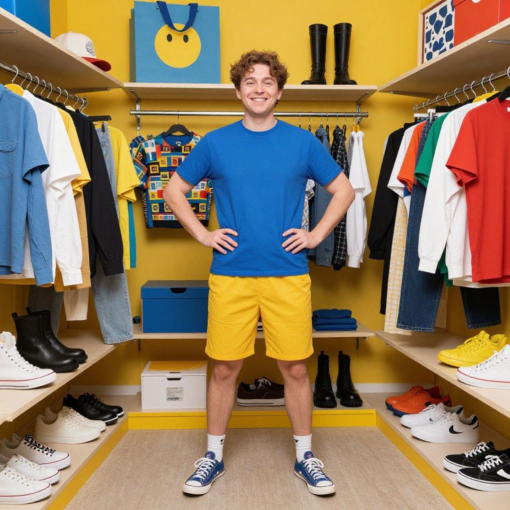 Photograph of a smiling young man with curly brown hair standing in a brightly lit, yellow-walled walk-in closet. He wears a blue t-shirt, yellow shorts, white socks, and black-and-white sneakers. The closet has shelves on both sides with assorted clothing: blue jeans, white and red t-shirts, black boots, and sneakers. A blue and yellow abstract painting hangs on the back wall. Shelves also hold folded clothes and boxes. The man's hands are on his hips, and he stands confidently in the center. The overall style is casual and cheerful.