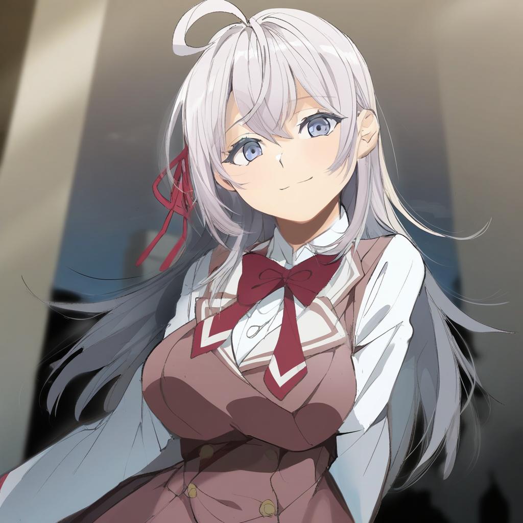 Alisa mikhailovna kujou, tokidoki bosotto roshia-go de dereru tonari no alya-san, 1girl, blue eyes, hair between eyes, long hair, white hair, grey hair, ahoge, hair ribbon, large breasts, school uniform, school uniform, red ribbon, long sleeves, by artist demizu posuka, leet