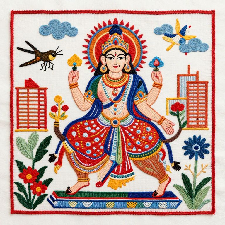 "Public Art evil dystopian Lakshmi in the city of El Dorado, in the form of Phulkari embroidery by Gunjan Aylawadi,"