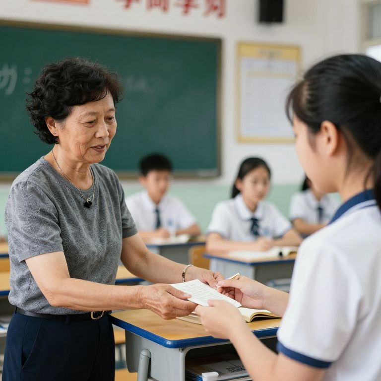 Photograph of an elderly Asian woman teacher with short black hair, wearing a grey short-sleeved shirt and black pants, standing and handing a paper to a young Asian girl with black hair, in a white shirt with blue trim, seated at a wooden desk in a classroom. Three other students, also in white shirts with blue trim, are in the blurred background, sitting at desks. The classroom has green chalkboards and educational posters on the walls. The teacher's expression is serious and focused. The image has vibrant colors and a slightly high-contrast style.
