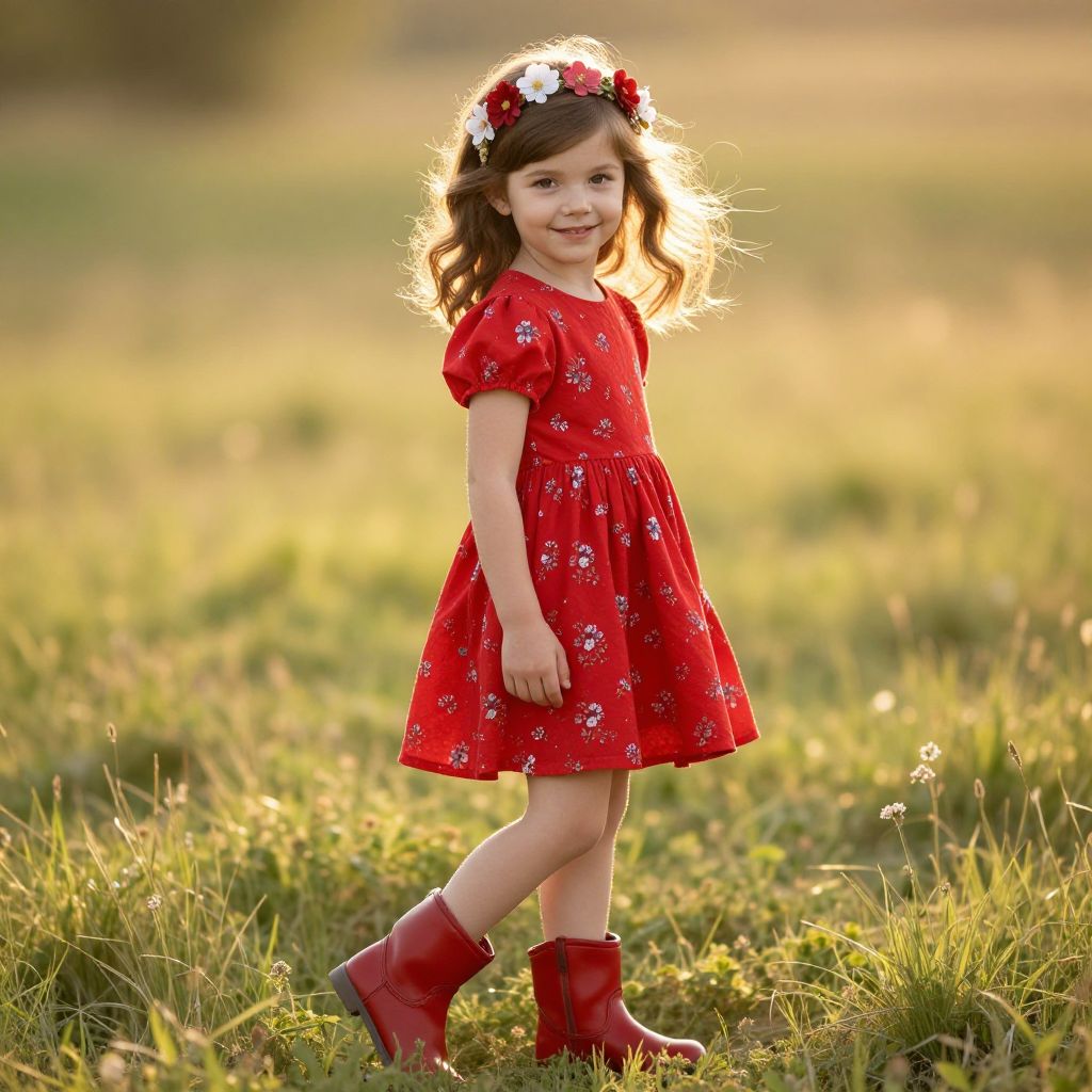 A beautiful young girl with long, flowing blonde hair and a vibrant wildflower tucked neatly into her braid, wearing a soft white dress with delicate red accents along the sleeves and hem, and a bright red ribbon tied elegantly around her waist, giving her a charming and joyful look, standing in a sunlit meadow with daisies and blooming roses in the background, warm golden hour lighting highlighting her features and the surrounding nature.