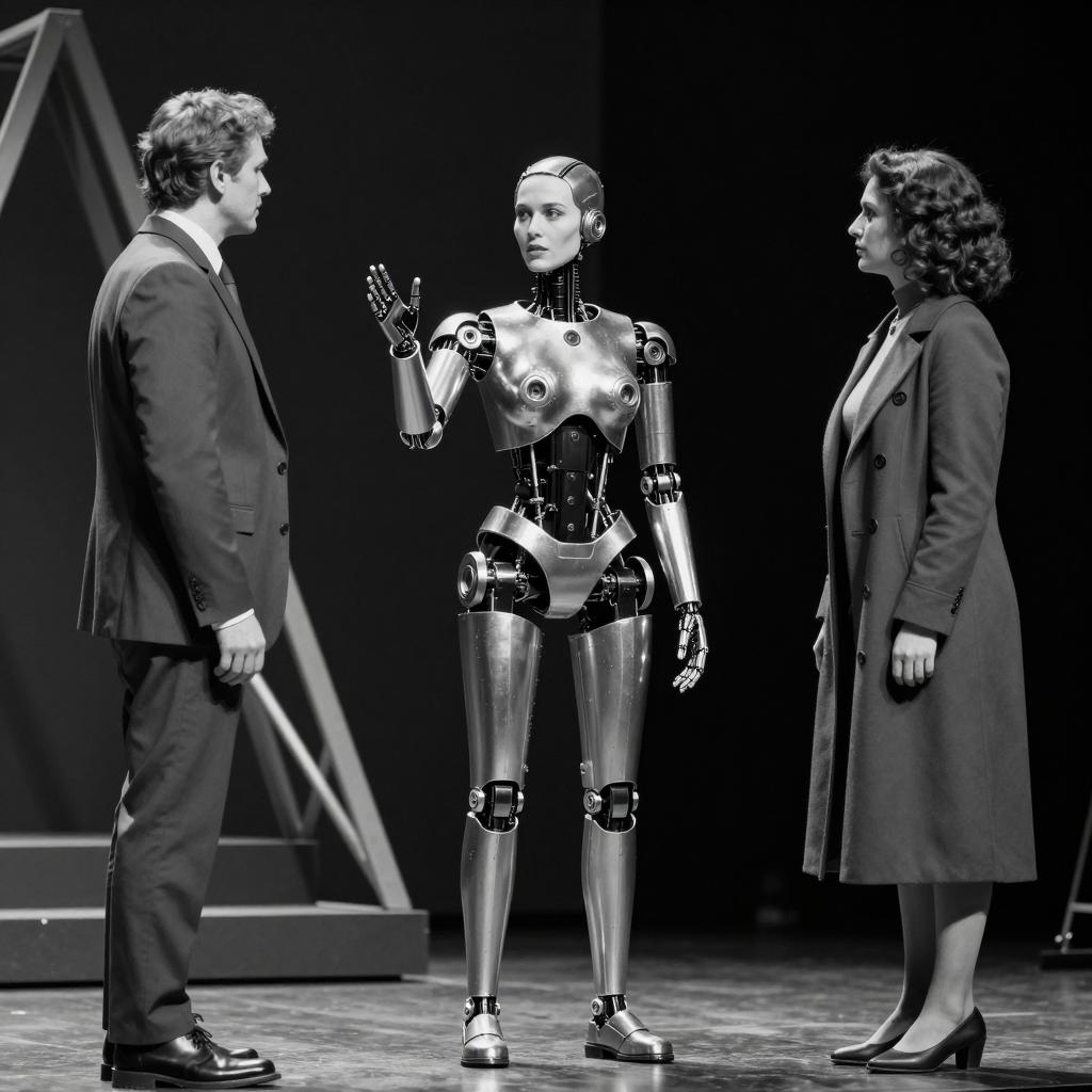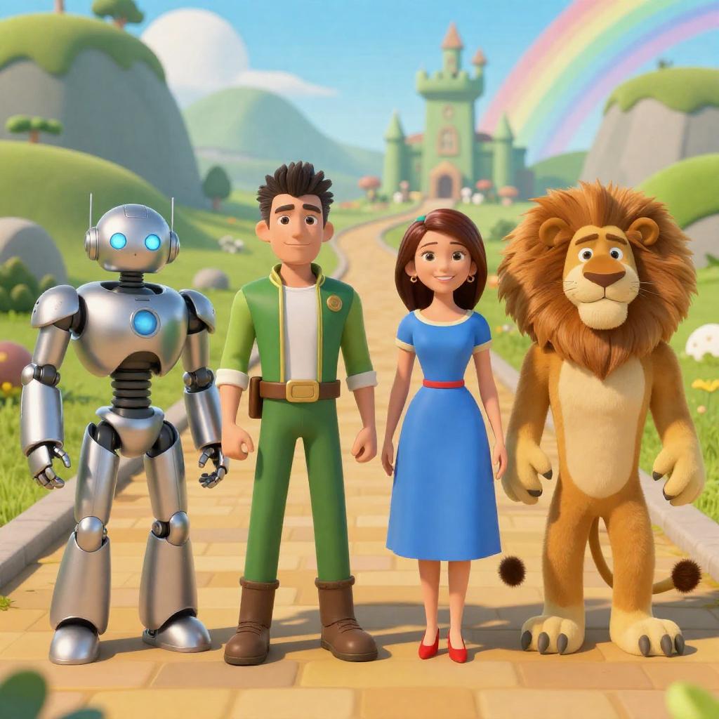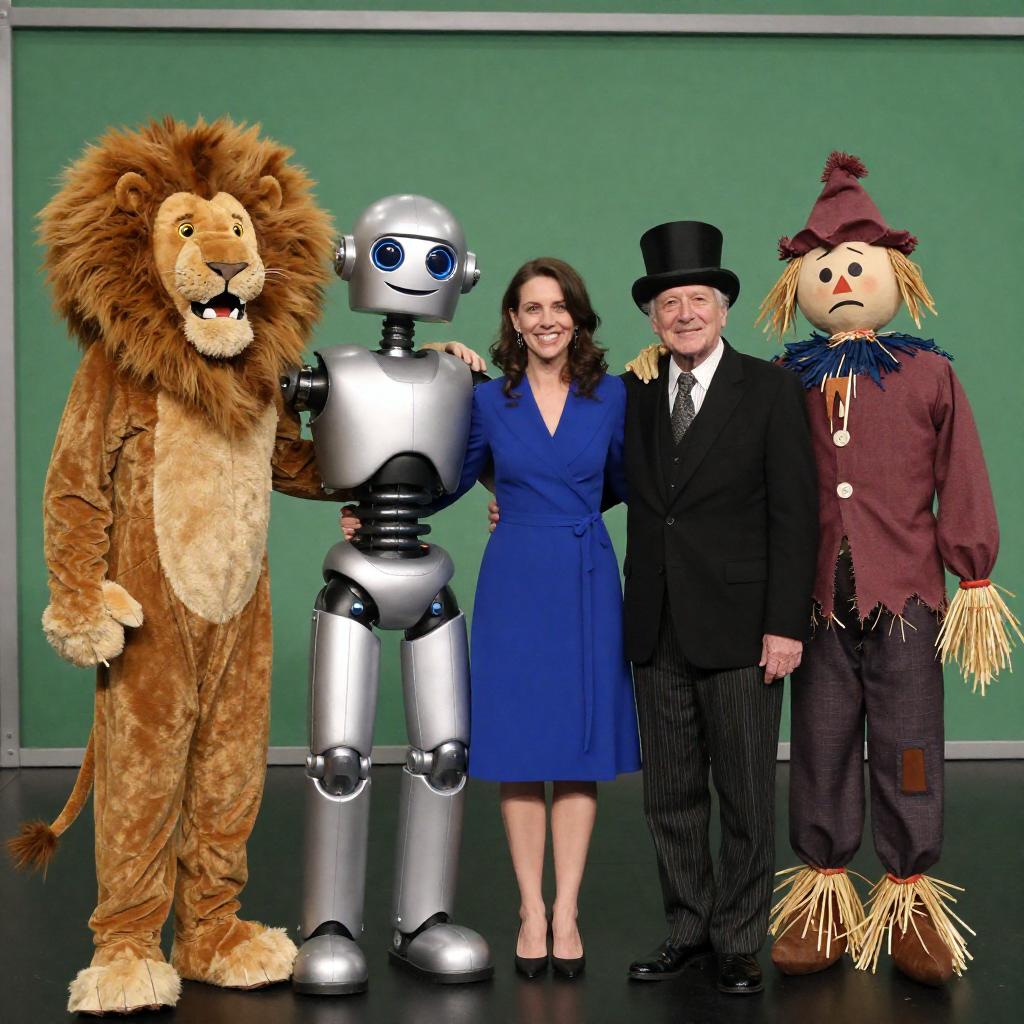 Photograph of five characters standing against a green background. Left: Lion costume with open mouth, brown fur. Center-left: Silver robot with helmet, smiling. Center: Woman in blue dress, smiling, arms around robot and man. Center-right: Older man in black top hat, black suit, striped pants, smiling. Right: Raggedy scarecrow with straw, sad expression. Characters stand in a row, arms around each other. Green background with metal frame.
