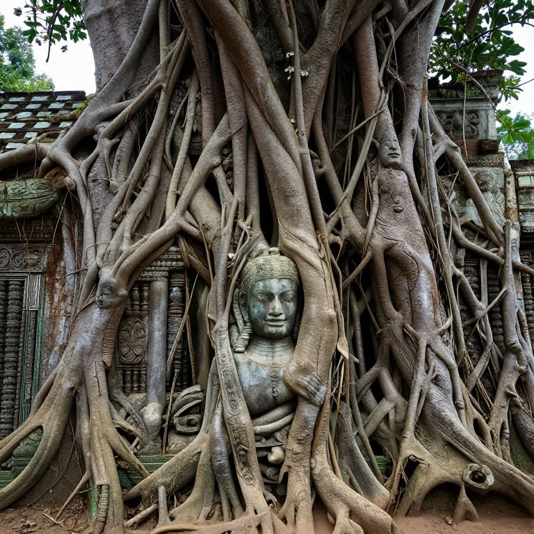 Photograph of a serene, stone Buddha head partially enveloped by large, intricate tree roots, set against an ancient, weathered stone wall.