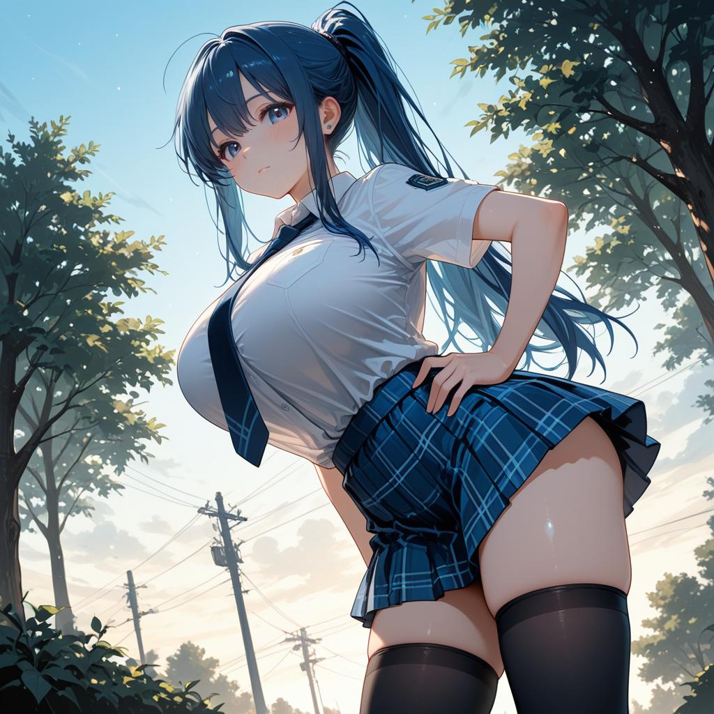 Masterpiece, best quality, absurdres, extremely detailed, illustration, cute, perfect lighting, 1girl, solo, leg up, spread legs, all fours, large breasts, embarrassed, street, outdoors