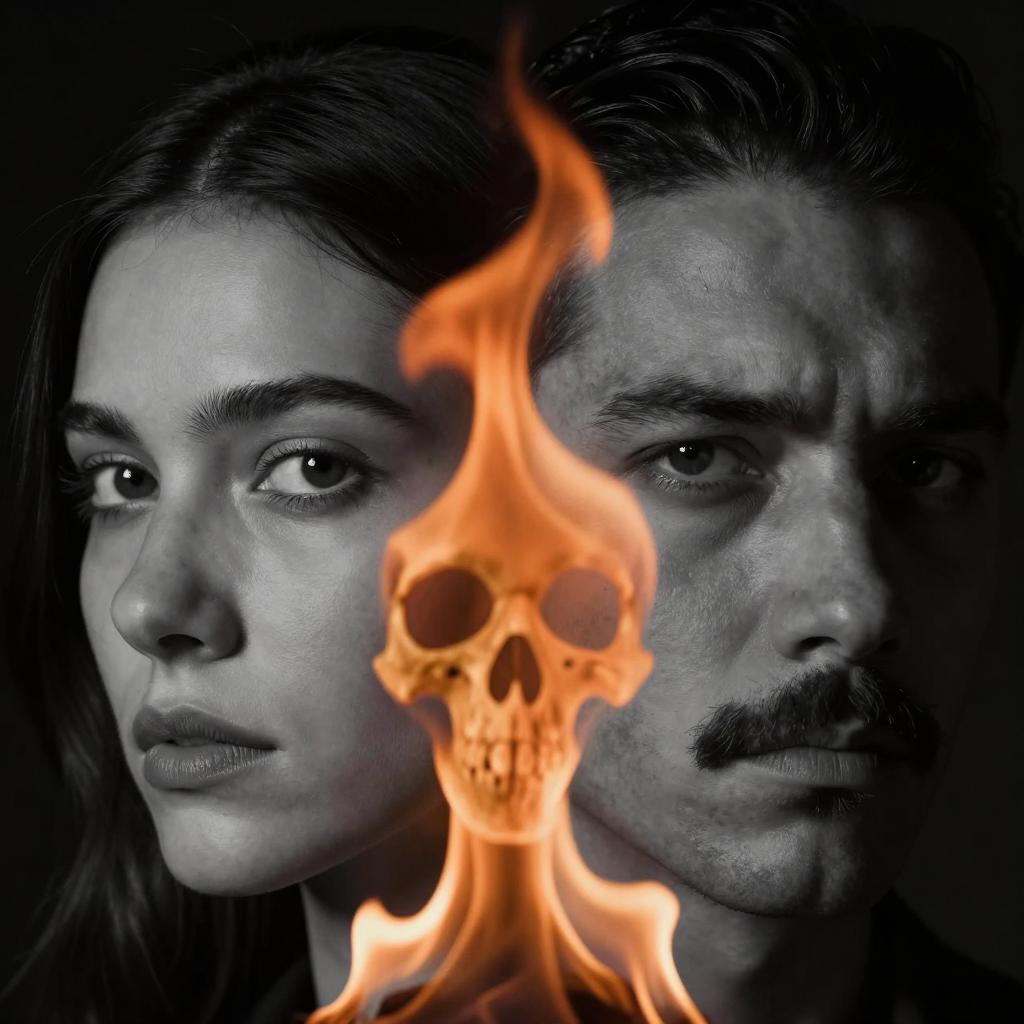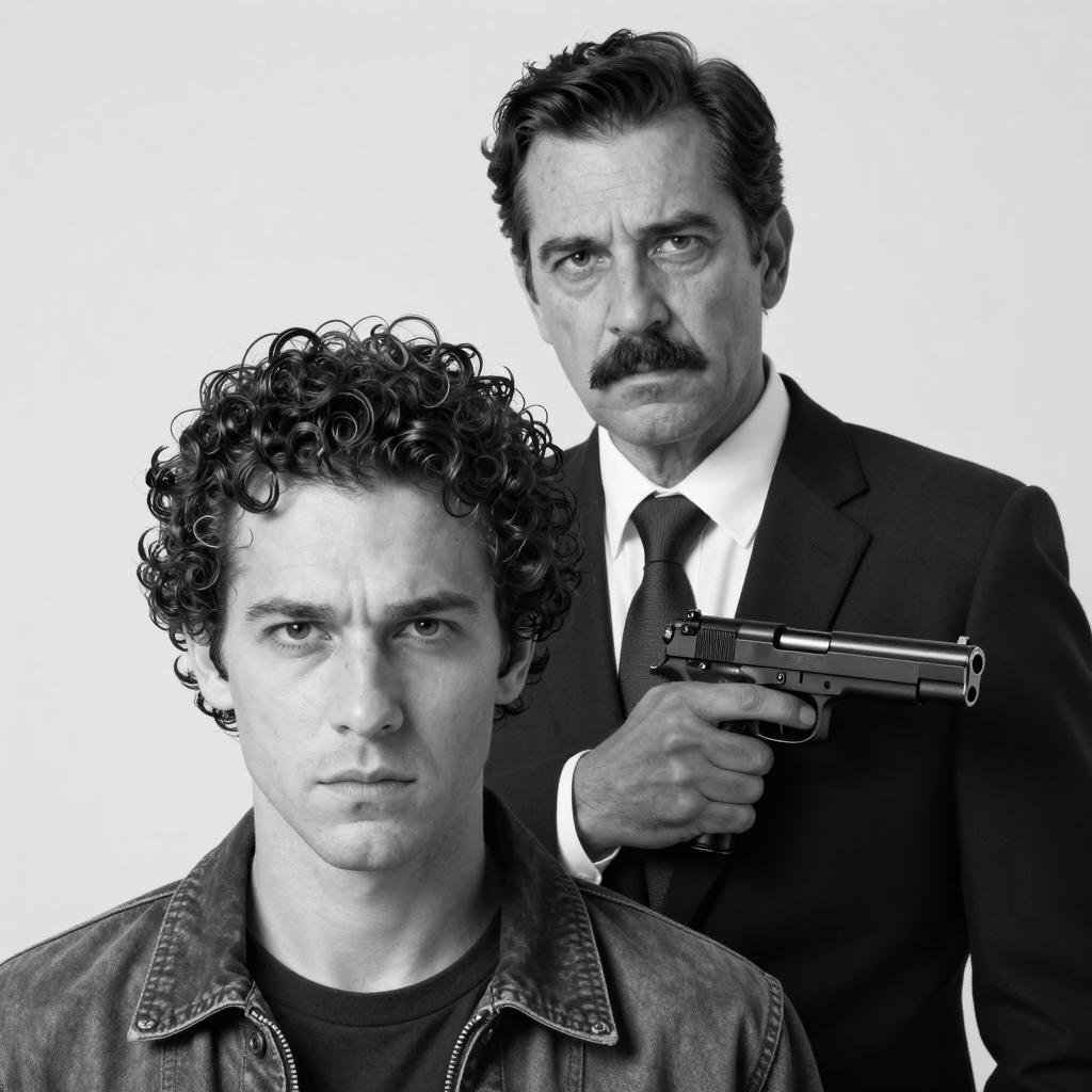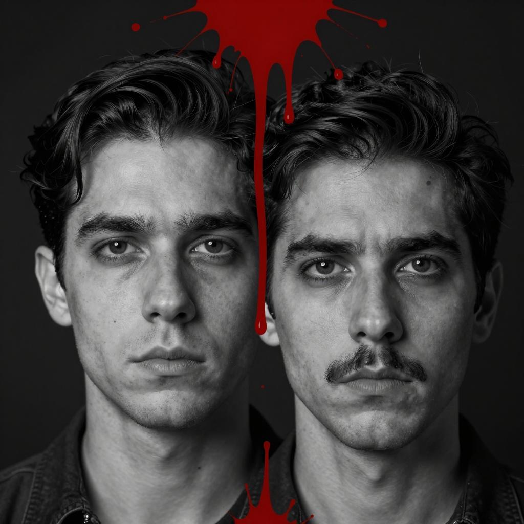 Photograph of two men's faces in a dark background. Blood splatter runs vertically between their faces. Both men have medium-length dark hair, mustaches, and intense expressions. Background is completely black. Red blood splatter contrasts with grayscale faces.