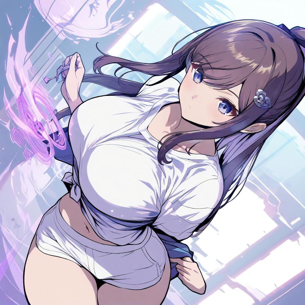 Araki nonoka (karaage bou), original, 1girl, purple eyes, blue eyes, brown hair, long hair, purple hair, sidelocks, ponytail, hairclip, large breasts, thighs, navel, collarbone, white shirt, by artist akaga hirotaka, animagine
