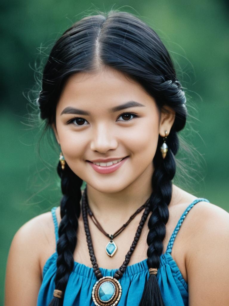 Pocahontas child, 1girl, solo, jewelry, braid, necklace, black hair, earrings, looking at viewer, blue eyes, long hair, blurry, realistic, blurry background, upper body, smile, twin braids