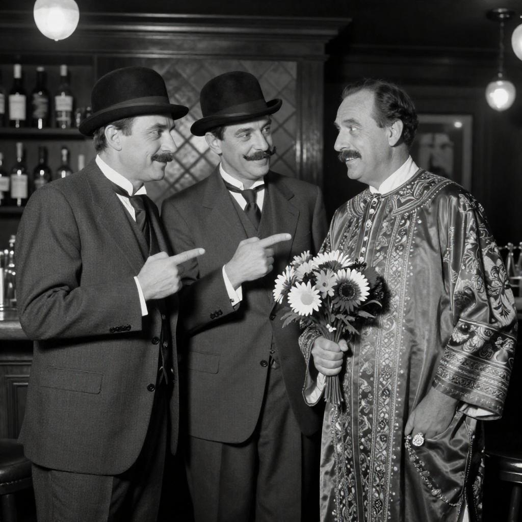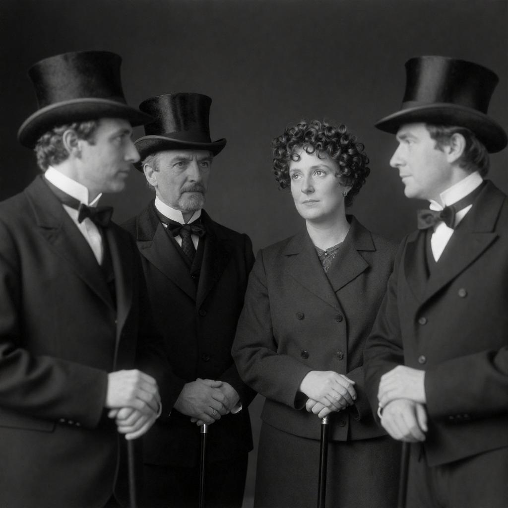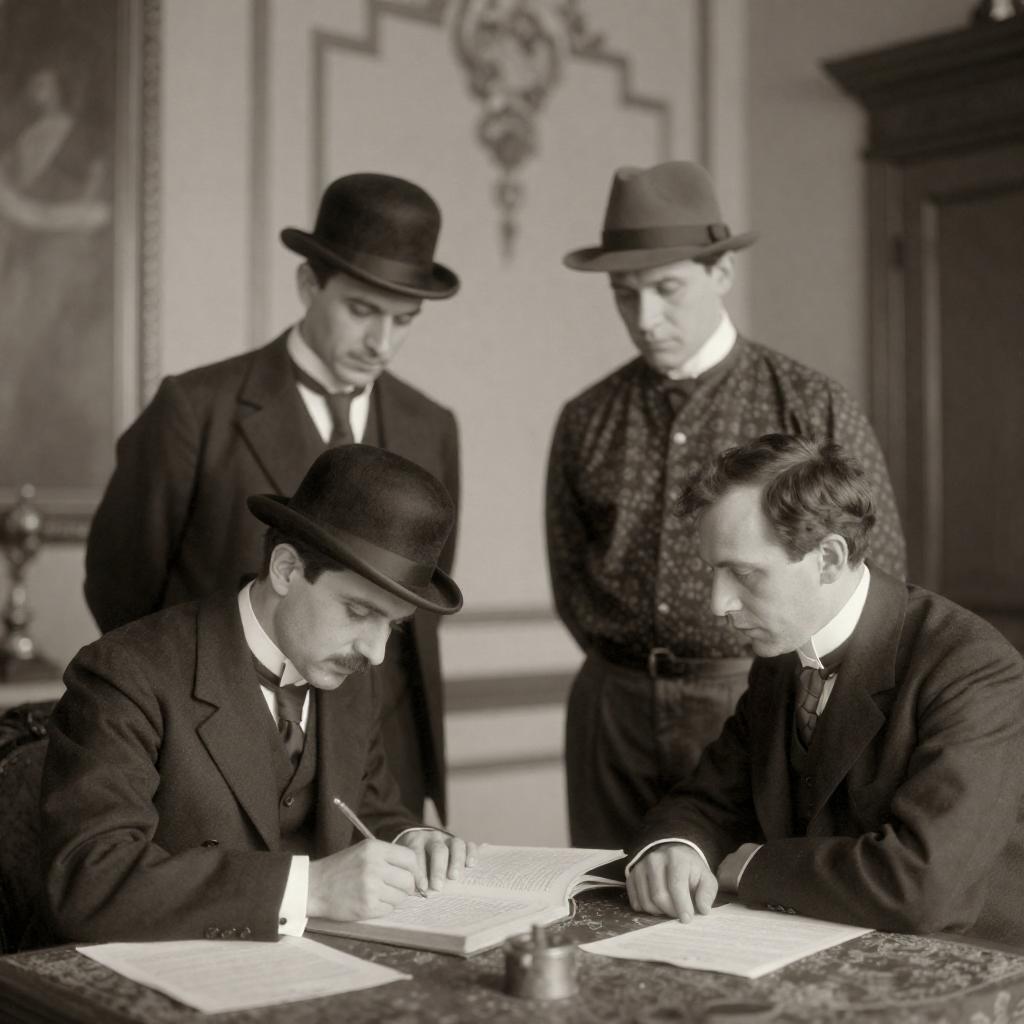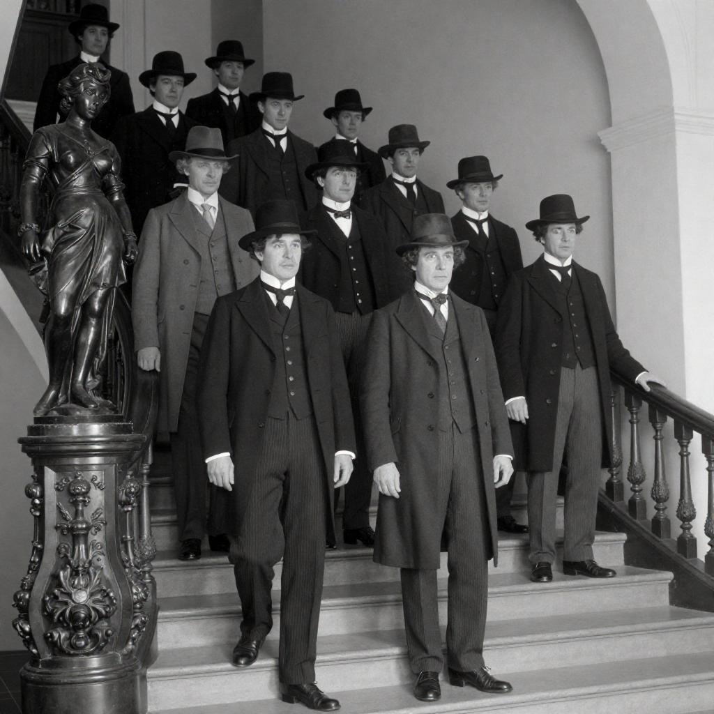 Black-and-white photograph of men in 19th-century attire dining in an ornate, patterned room. Five men seated at tables with white cloths, wearing hats and vests. One man with a mustache reclines, leaning on a chair. Top-hatted man on right holds a paper. Checkered floor, detailed woodwork, and lit candles in background. Multiple men standing and sitting, engaged in conversation. Intense expressions on some faces.