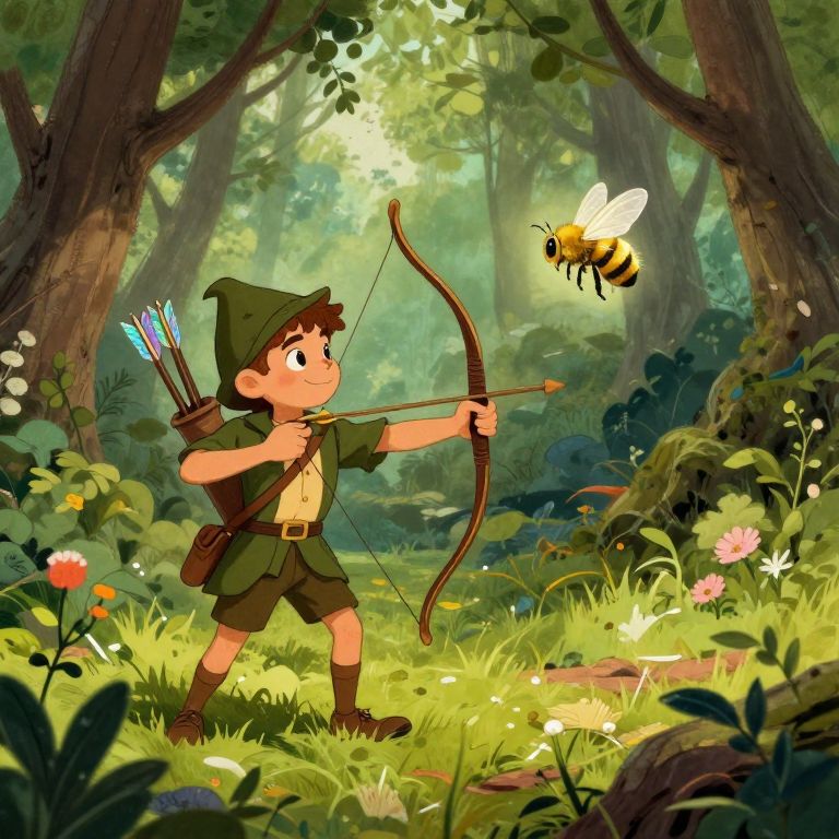 Sohrab depicted as a legendary archer in a lush forest, pulling his bowstring with focused determination, nature elements all around including ancient ruins, bright and vivid colors with a sense of motion and energy