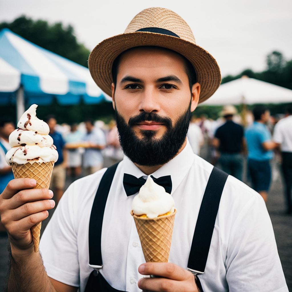 Ice cream man fancy dress ,1boy, male focus, food, hat, facial hair, ice cream, solo, shirt, beard, blurry background, looking at viewer, white shirt, holding, blurry, ice cream cone, suspenders, holding food, collared shirt, realistic, outdoors, upper body