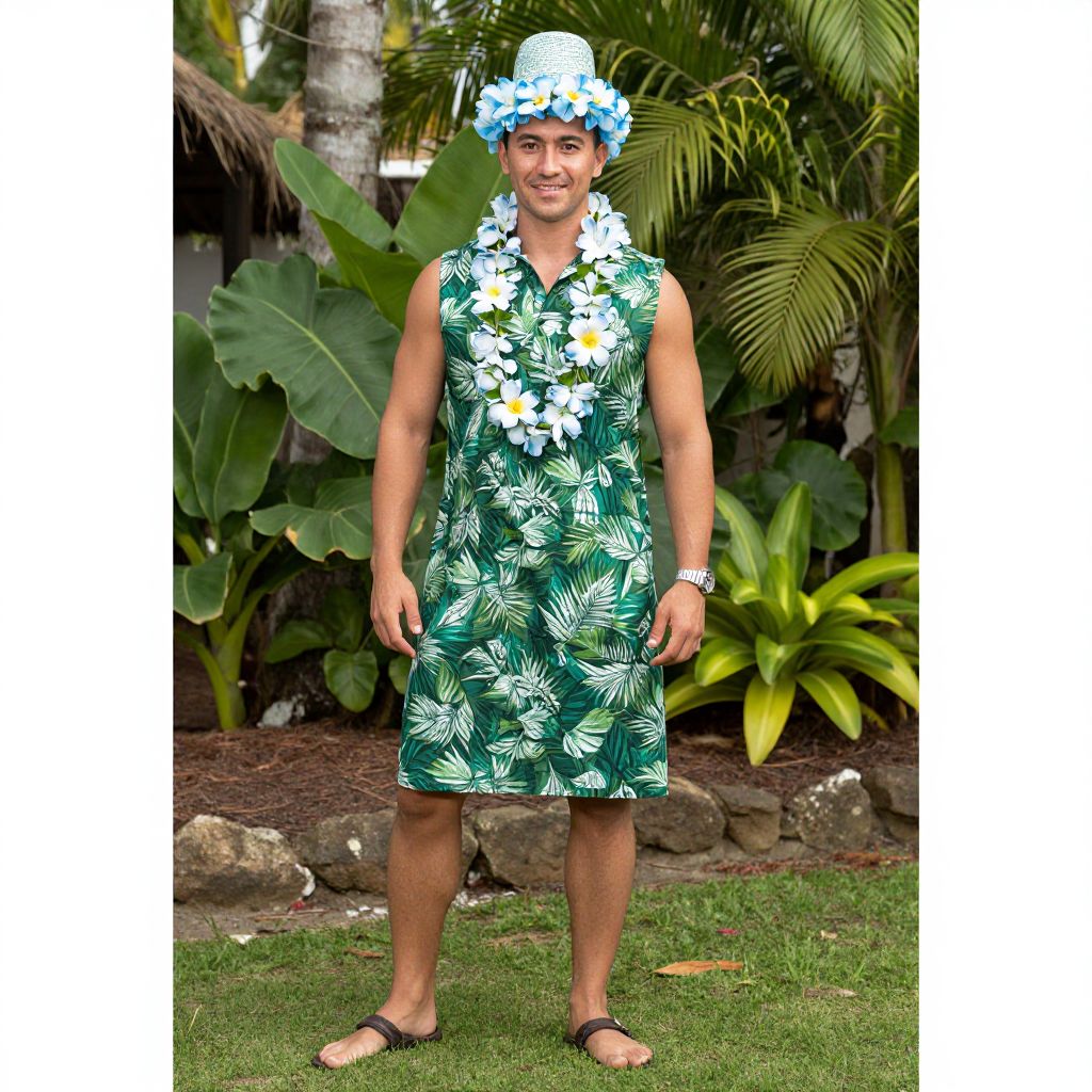 Photograph of a smiling man standing outdoors on green grass. He wears a blue floral lei on his head, a green sleeveless shirt with white hibiscus patterns, and black sandals. His shirt reaches mid-thigh, revealing his muscular build. The background features large green tropical leaves and palm trees, with a stone border at the bottom. The man's skin tone is light brown, and he has short dark hair. The bright, colorful attire and lei suggest a Hawaiian-inspired theme. He stands confidently with his hands by his sides, exuding a relaxed, cheerful vibe.
