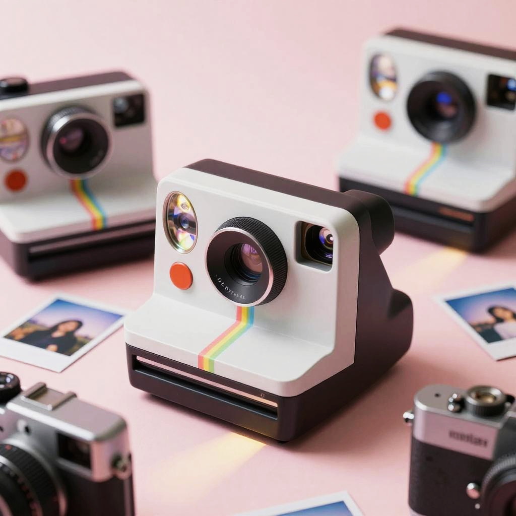 Polaroid generator surrounded by vintage cameras and colorful light leaks, producing instant photos with dreamy, nostalgic vibes, intricate mechanical details, soft pastel background, hyper-realistic style, warm tones blending with cool shadows, cinematic lighting